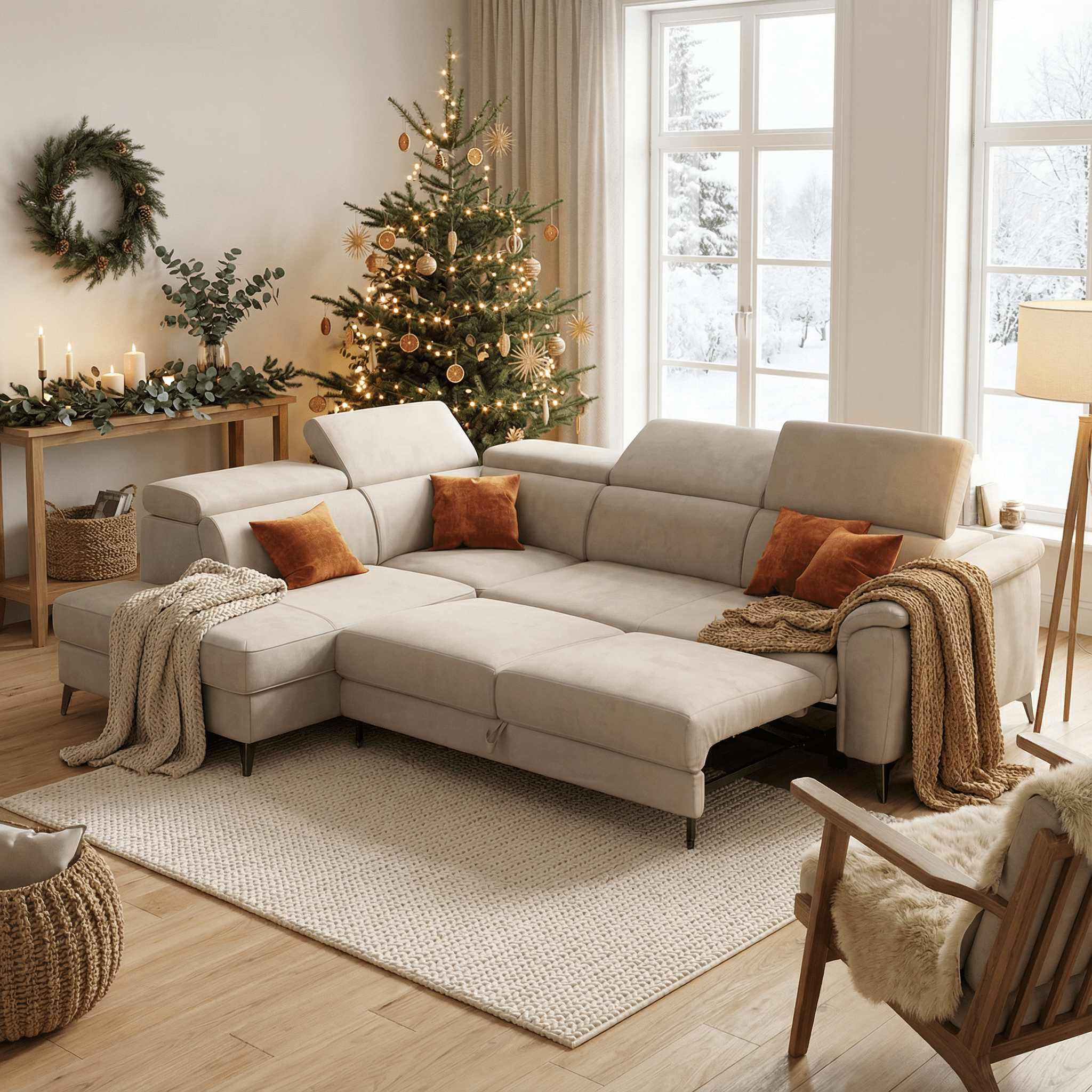Divano letto angolare con poggiatesta reclinabili e rivestimento impermeabile T02 panna