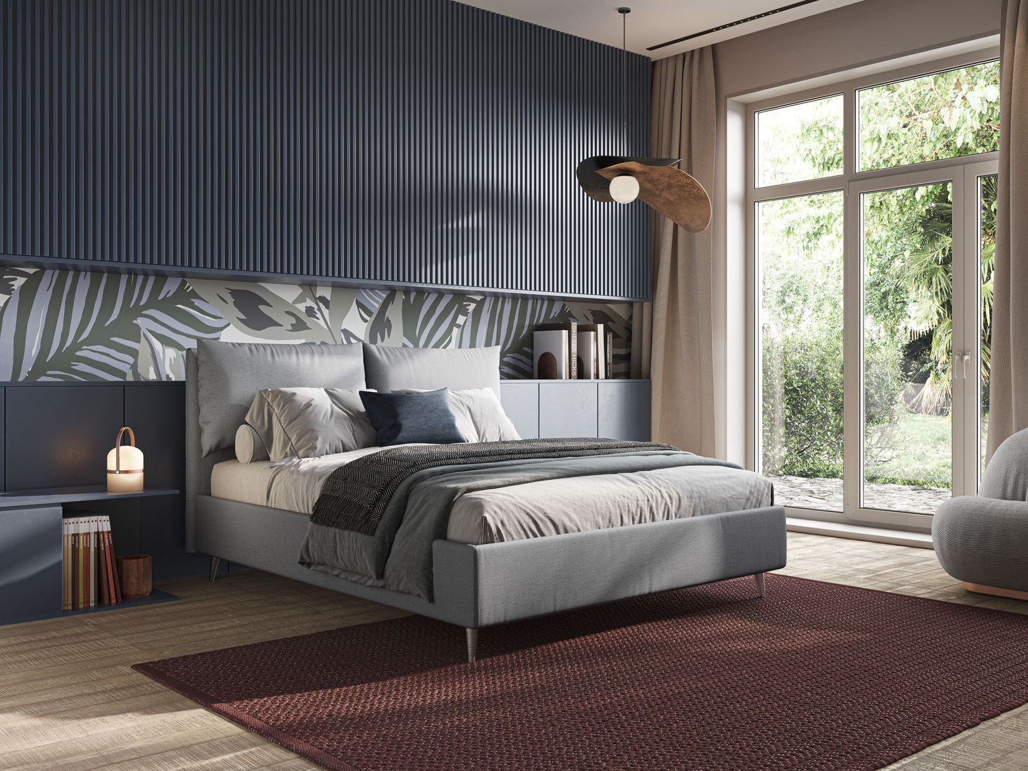 Skandinavisches platzsparendes Boxspringbett mit Lattenrost aus wasserfestem geflammtem Stoff T03 hellgrau