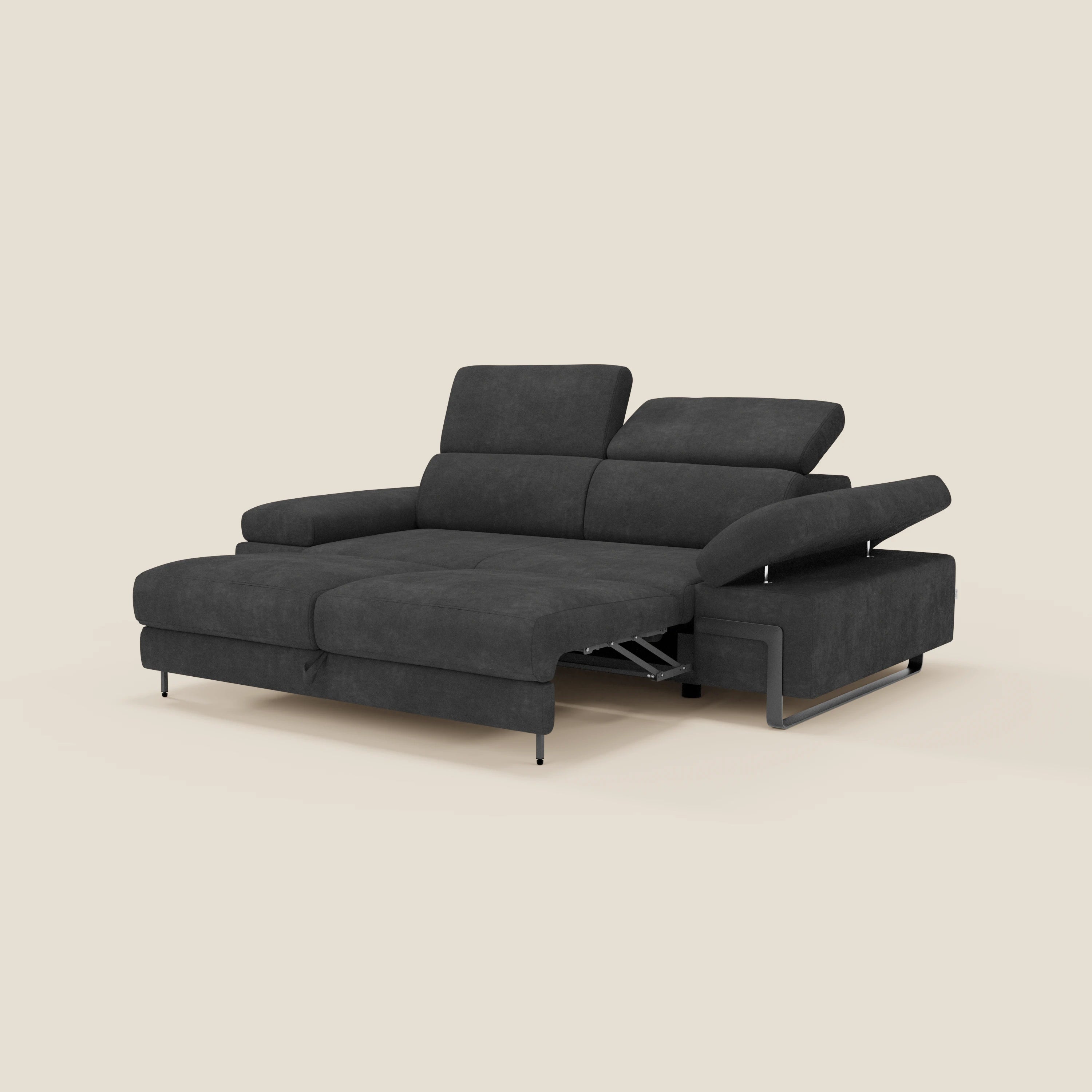 Il divano 3 posti Zayana di Divani.Store è caratterizzato da una seduta estraibile, braccioli e poggiatesta regolabili in tessuto impermeabile T02 petrolio, eleganti gambe in metallo ed è presentato con il bracciolo destro sollevato su uno sfondo beige chiaro.Il divano 3 posti Zayana di Divani.Store è caratterizzato da un elemento estraibile, braccioli e poggiatesta regolabili in tessuto impermeabile T02 petrolio. Un braccio si inclina con un supporto metallico; parte della seduta si estrae per formare un letto. Fondo bianco sporco.