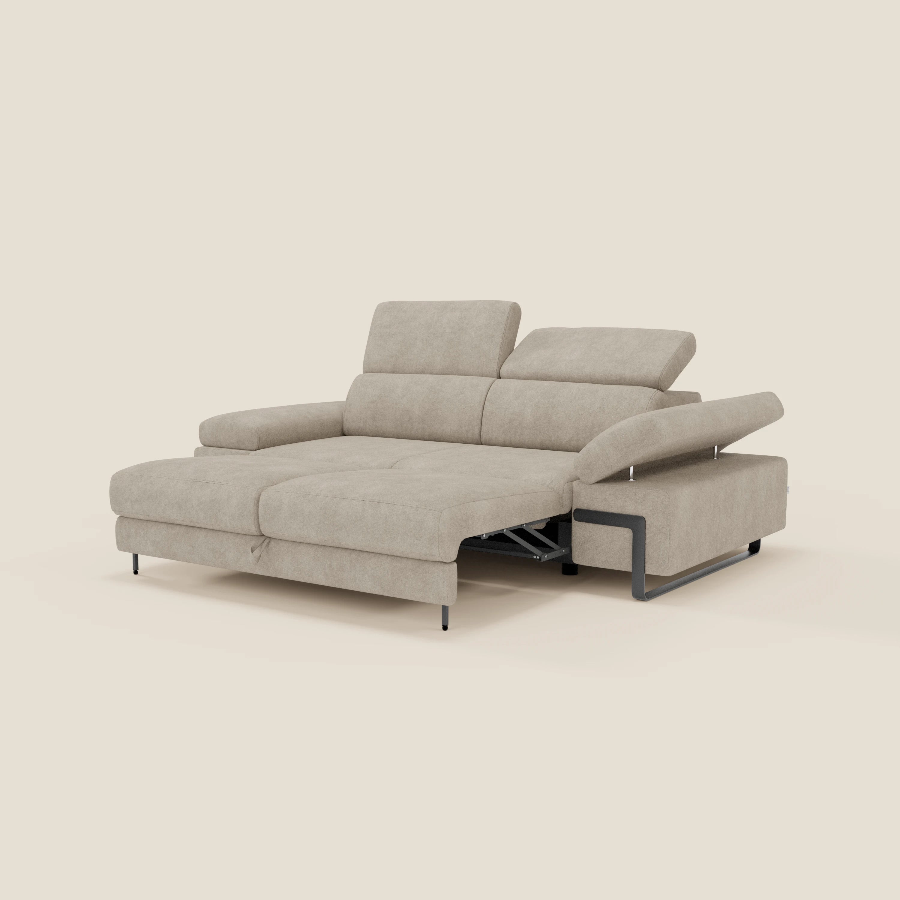 Il divano angolare estraibile Zayana di Divani.Store in T02 beige è caratterizzato da tre sedute, una chaise longue rivolta a sinistra, braccioli e poggiatesta reclinabili, gambe minimaliste in metallo e cuscini in tessuto, su uno sfondo bianco sporco.Il divano angolare estraibile Zayana di Divani.Store, in tessuto impermeabile T02 beige, presenta braccioli e poggiatesta reclinabili, ampia penisola e gambe in metallo. Design moderno a forma di L su sfondo chiaro.