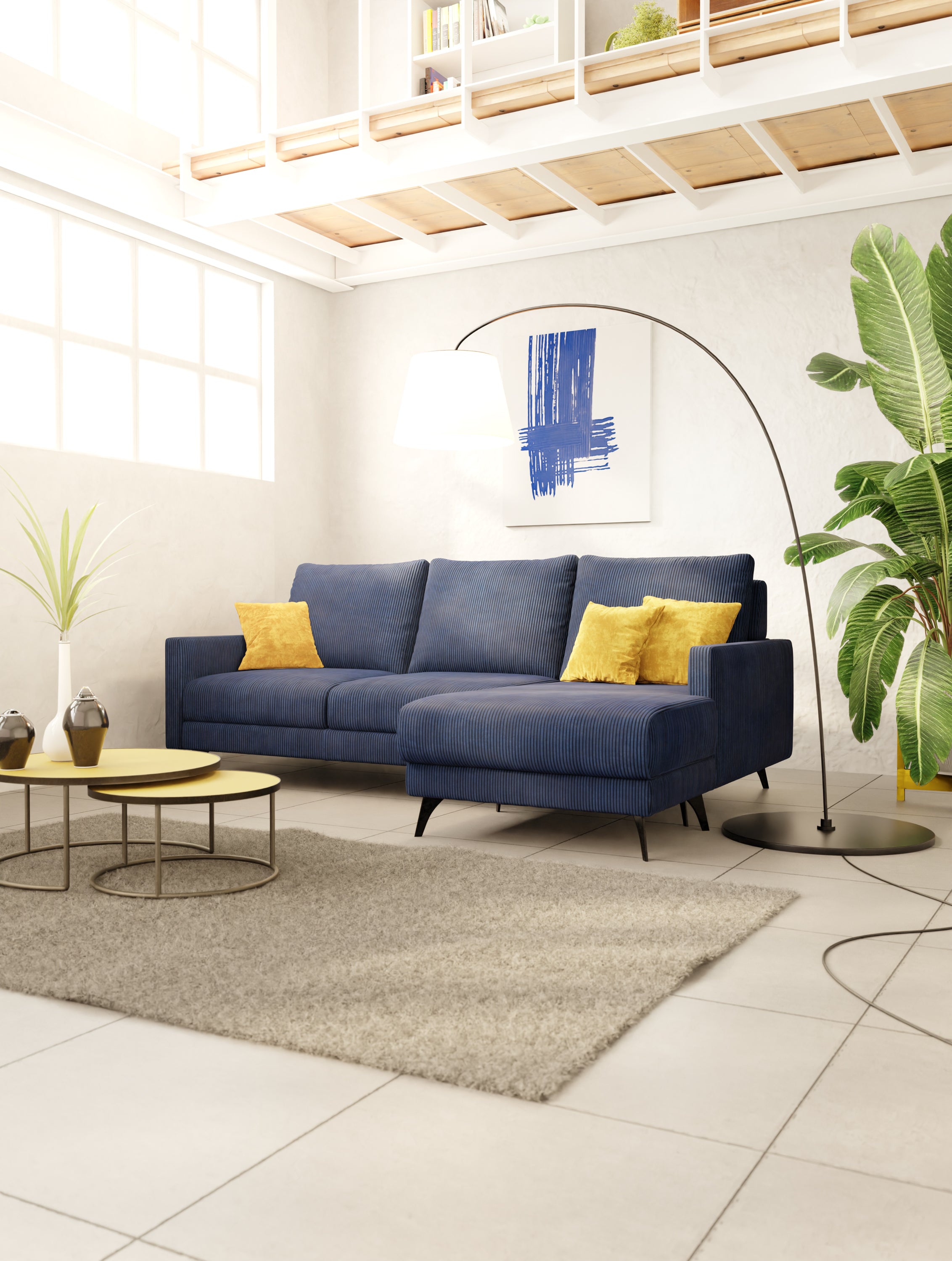 Ein salbeigrünes oder puderblaues Modulsofa verleiht dem Ganzen einen frischen und modernen Touch, perfekt für junge und zeitgenössische Umgebungen.