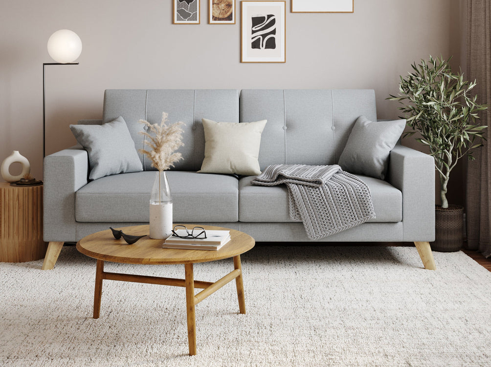 Ein beigefarbenes oder perlgraues Schlafsofa ist die perfekte Wahl für alle, die nur wenig Platz haben und ein helles und geräumiges Gefühl im Raum haben möchten. Ein 3-sitziges Schlafsofa aus beigem Stoff zum Beispiel!