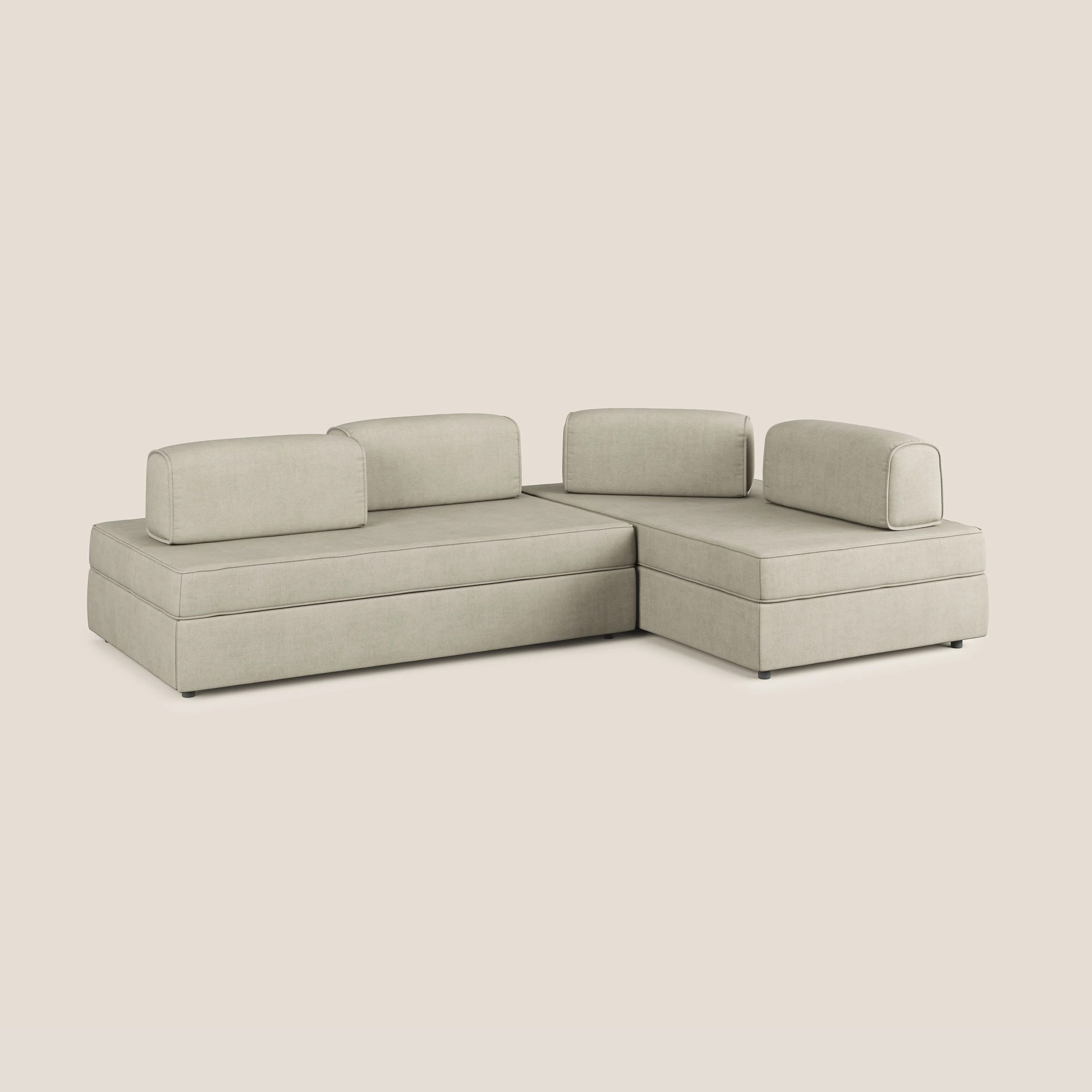 Ein hellgraues oder sandbeiges Modulsofa ist ideal für diejenigen, die eine neutrale und stets aktuelle Option wünschen, die sich an jede Entwicklung des Raums anpassen kann.