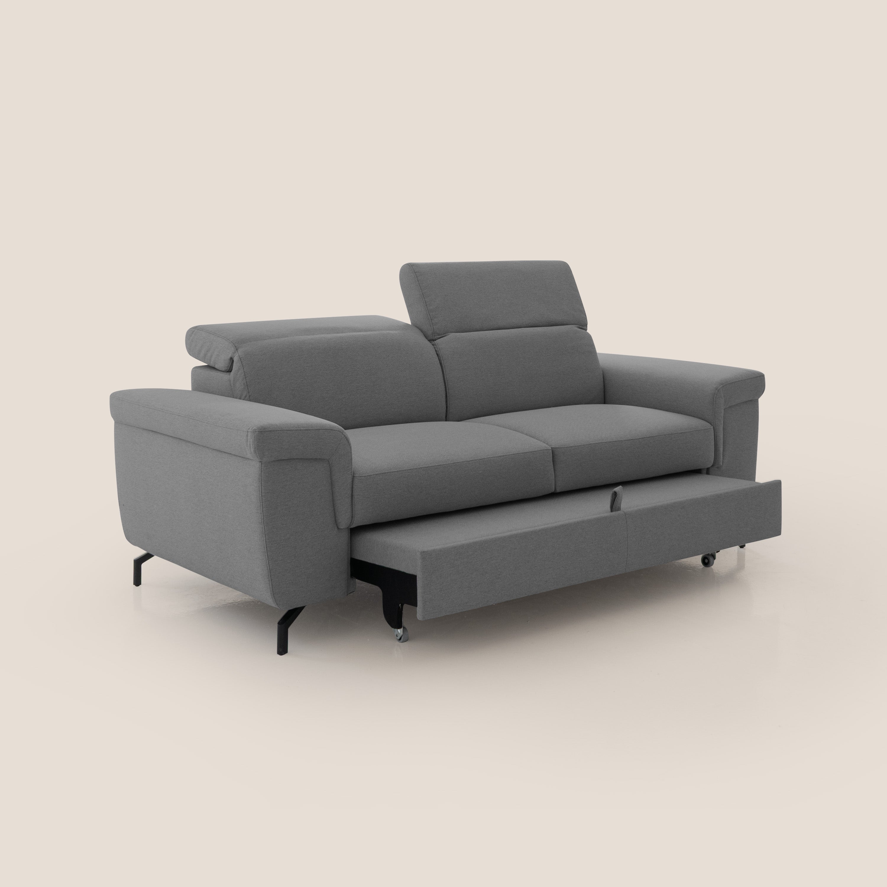 Ausziehbarer Hocker mit gummierten, kratzfesten Rollen: verwandelt das Sofa in eine Halbinsel, auf der man sich komplett ausstrecken kann