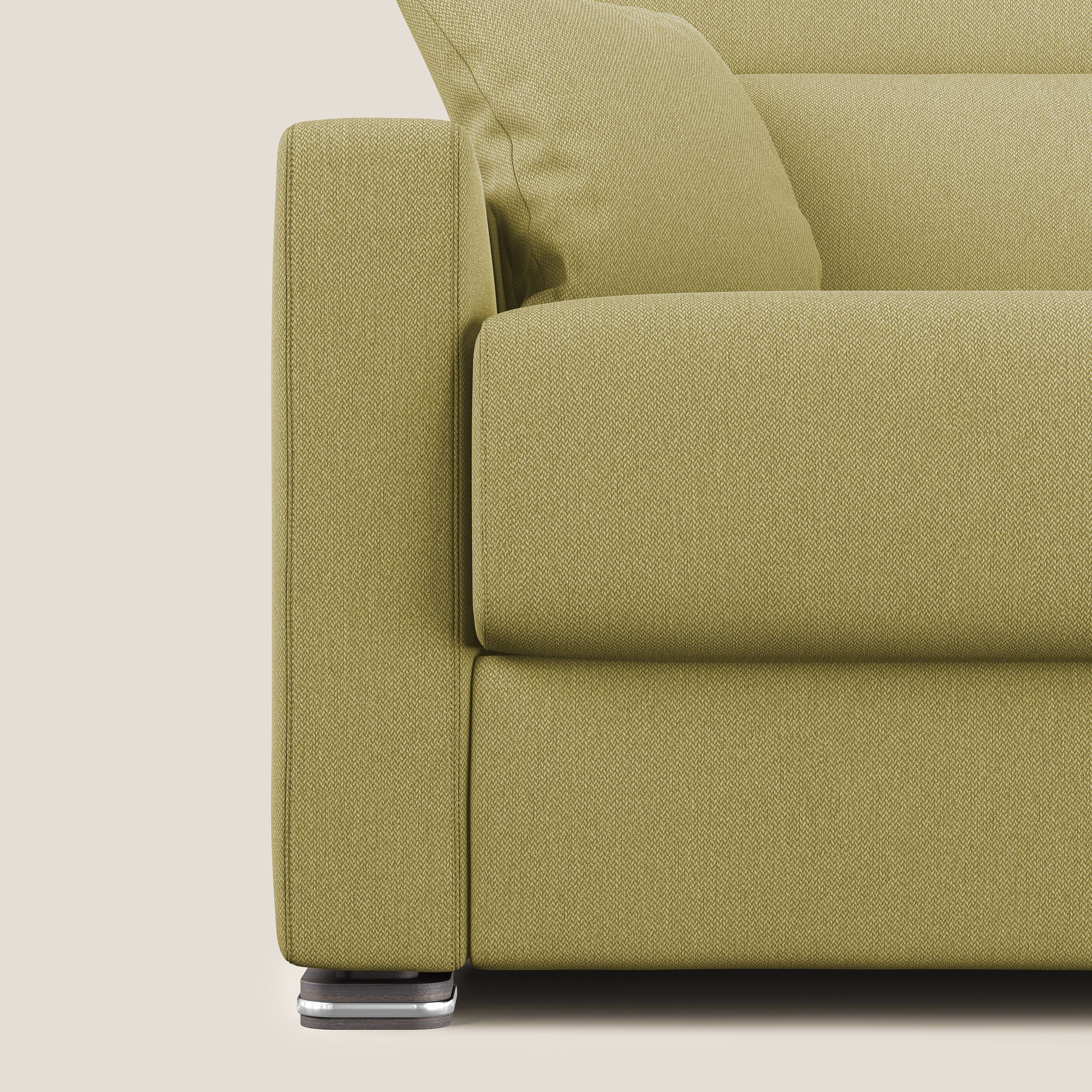 Amber, ein Schlafsofa aus wasserfestem, schmutzabweisendem Stoff mit einer H14 cm hohen Matratze und der Möglichkeit, es mit einer H18 cm hohen Matratze und einem Lattenrost auszustatten. Das Schlafsofa Amber mit seinen weichen Linien und seinem modernen, vom neuesten Design inspirierten Stil verfügt über eine gepolsterte Rückenlehne und Kopfstützen mit 7 verschiedenen Neigungsstufen.
