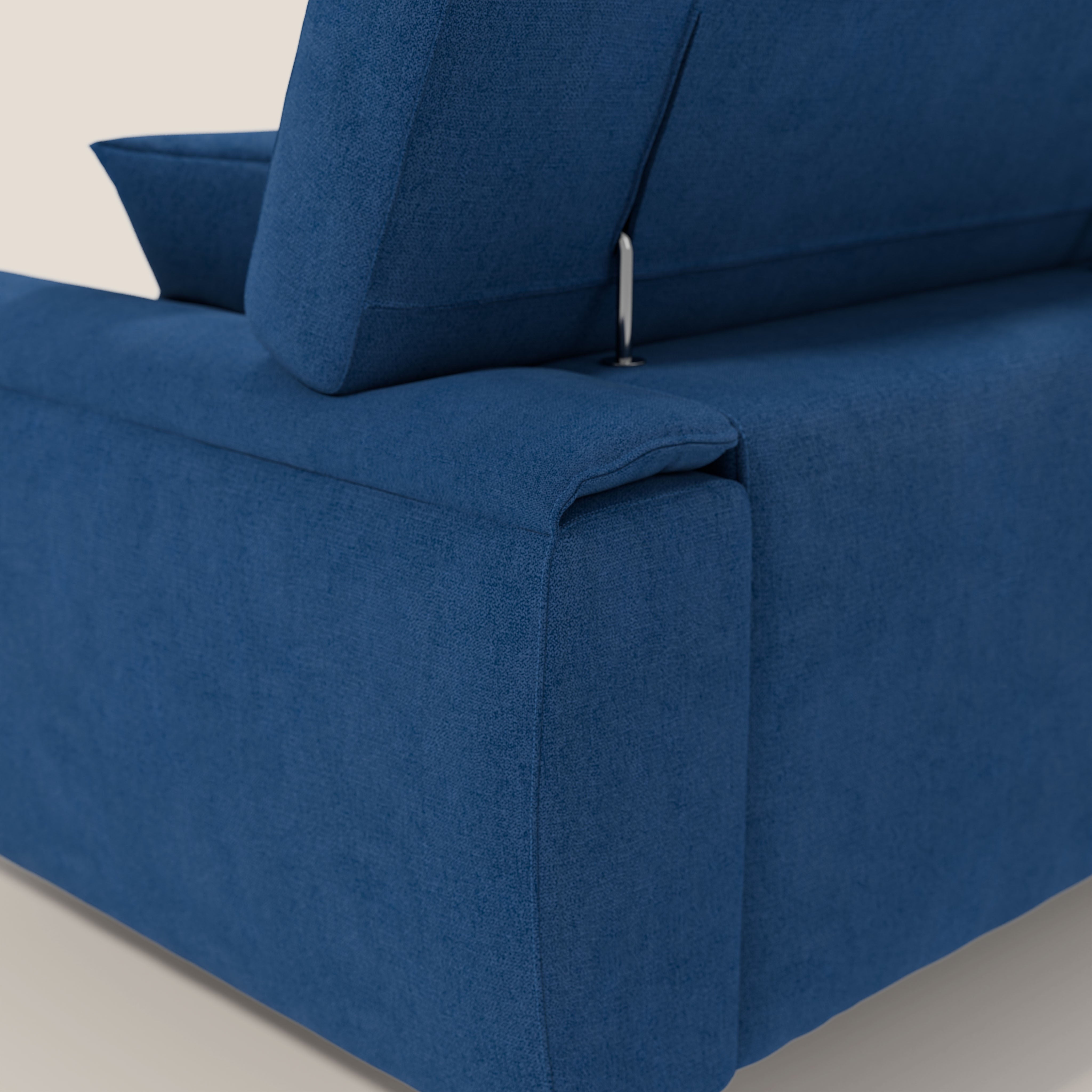 Der schmutz- und wasserabweisende Stoffbezug, der komplett abnehmbar ist, macht das Sofa pflegeleicht und langlebig. Die 15 cm hohen Füße aus verchromtem Stahl verleihen dem Sofa einen modernen Look und erleichtern die Reinigung des Bodens, wodurch Ästhetik und Funktionalität vereint werden.