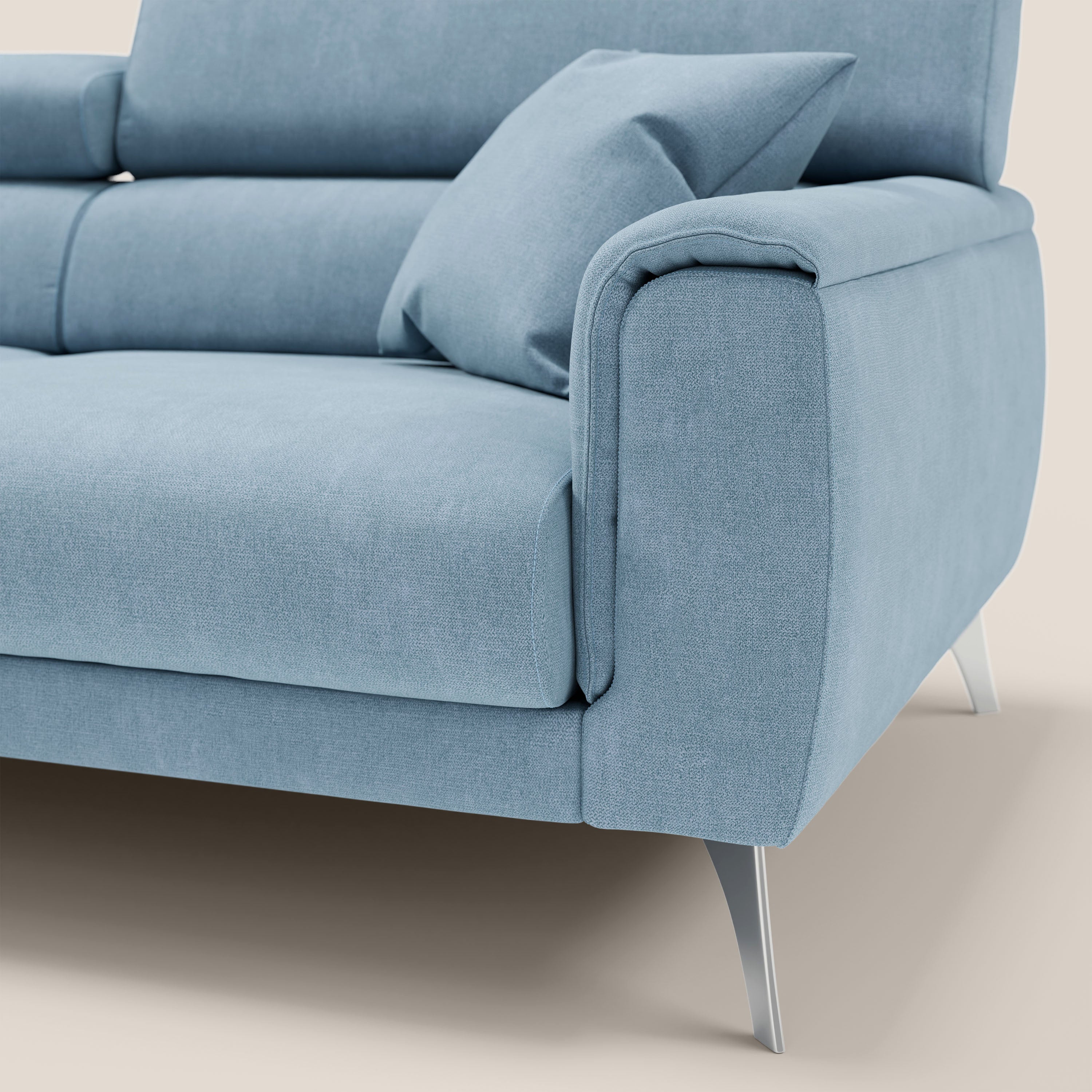 Caravaggio zeichnet sich durch seine essentiellen und modernen Linien aus, die durch innovative technische Details ergänzt werden. Die ausziehbaren Sitze mit Schiebesystem ermöglichen es Ihnen, die Tiefe des Sofas an Ihre Bedürfnisse anzupassen und bis zu +40 cm auszuziehen, um maximale Entspannung zu garantieren. Die verstellbaren Kopfstützen mit 30 Neigungsstufen vervollständigen das Komforterlebnis und machen es perfekt für jede Position, von der täglichen Entspannung bis zum Lesen oder Filmschauen.