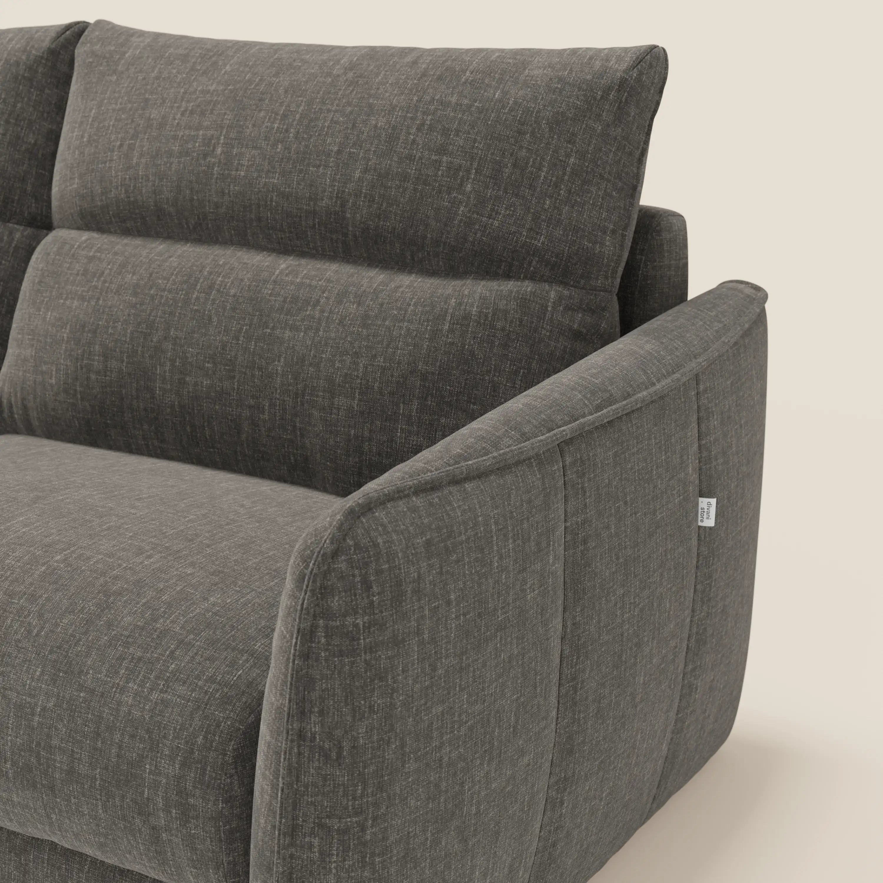 Elios ist das perfekte Schlafsofa für alle, die Komfort suchen, ohne Kompromisse beim Design einzugehen. Seine hohen Rückenlehnen mit beflockter Polsterung bieten eine weiche und entspannende Unterstützung, während die leicht ausgestellten Armlehnen dem Sofa einen modernen und eleganten Look verleihen. Maßgeschneiderte Details wie die Zwickelnaht an der Rückenlehne und der spezielle Welleneffekt an der Armlehne machen Elios zu einem echten Star im Wohnbereich.