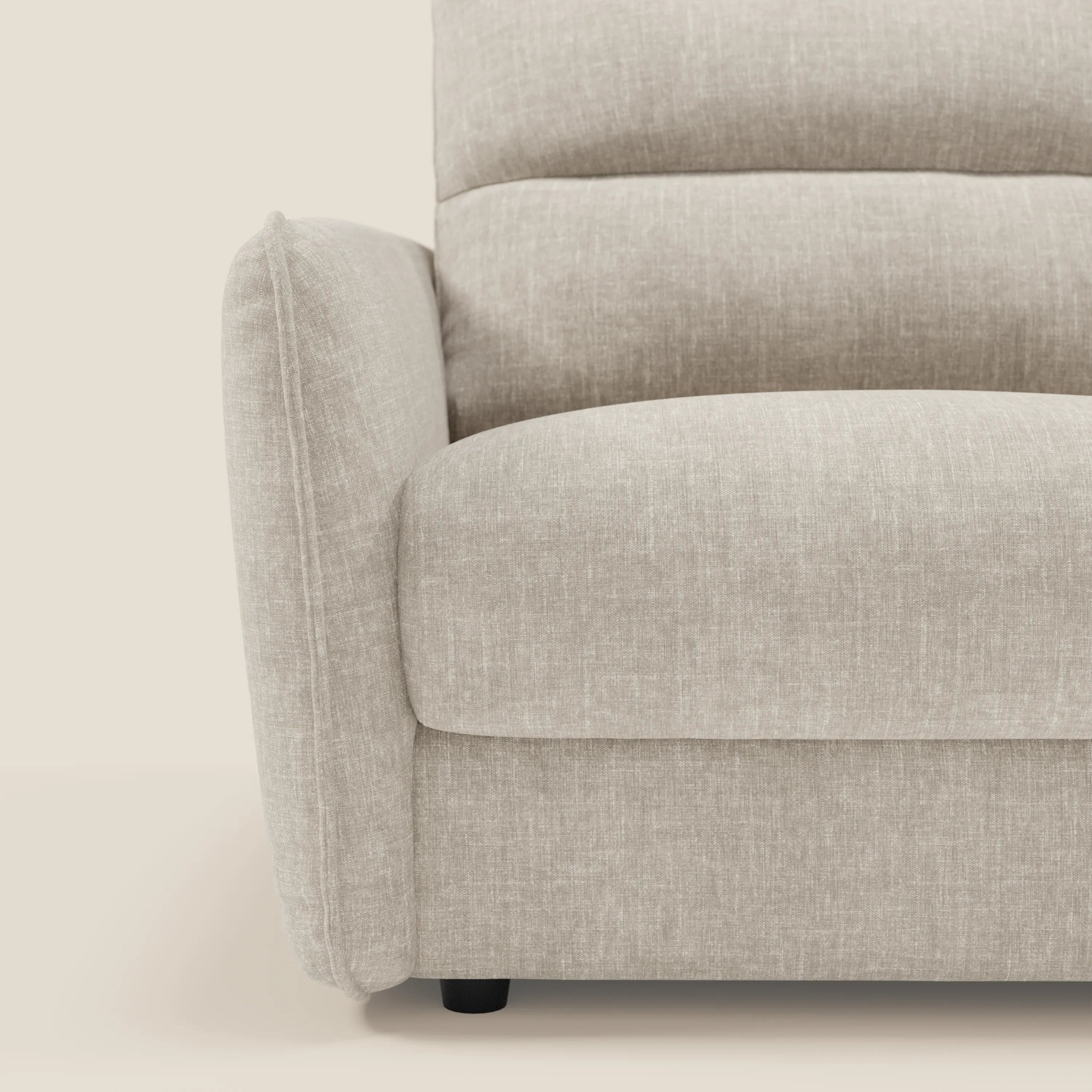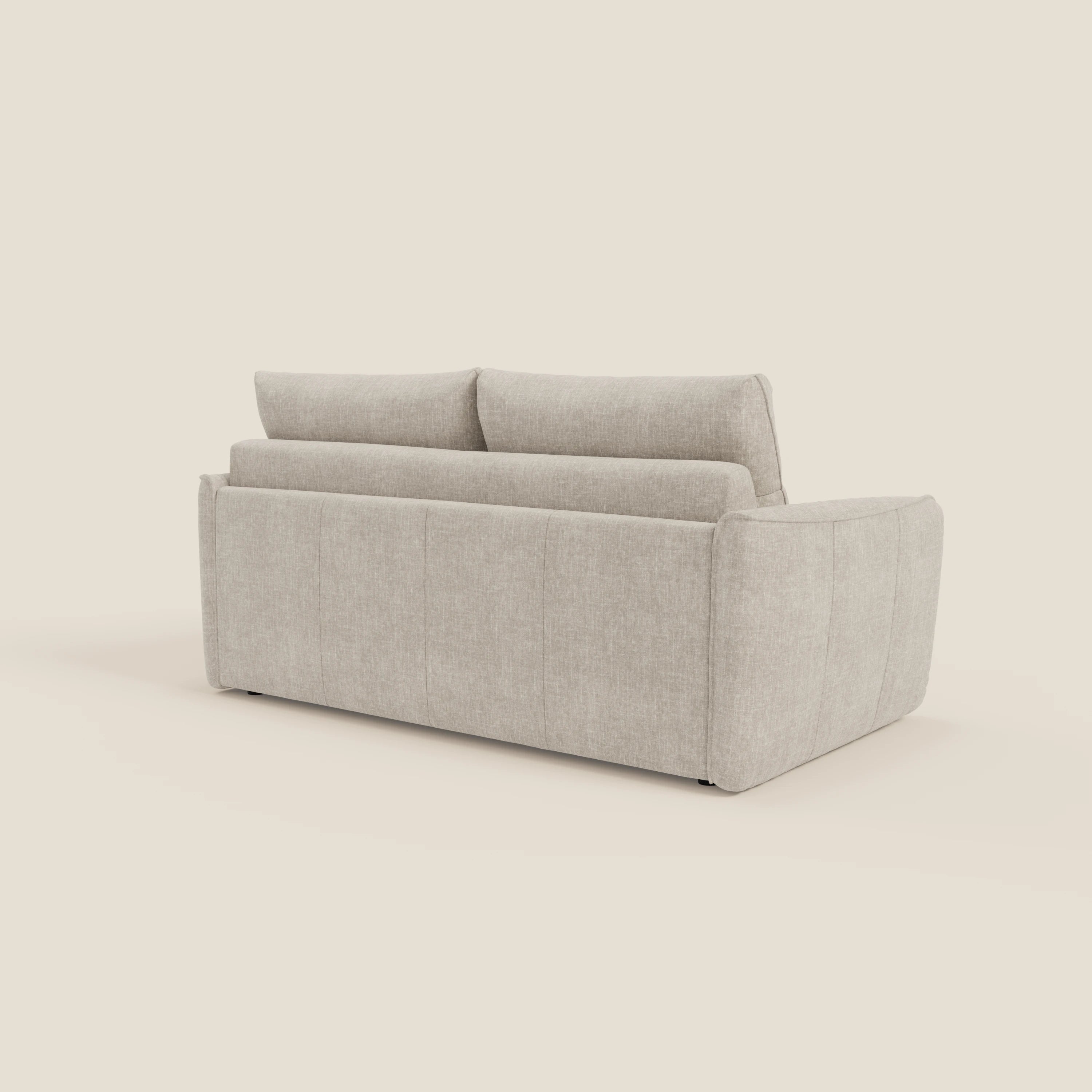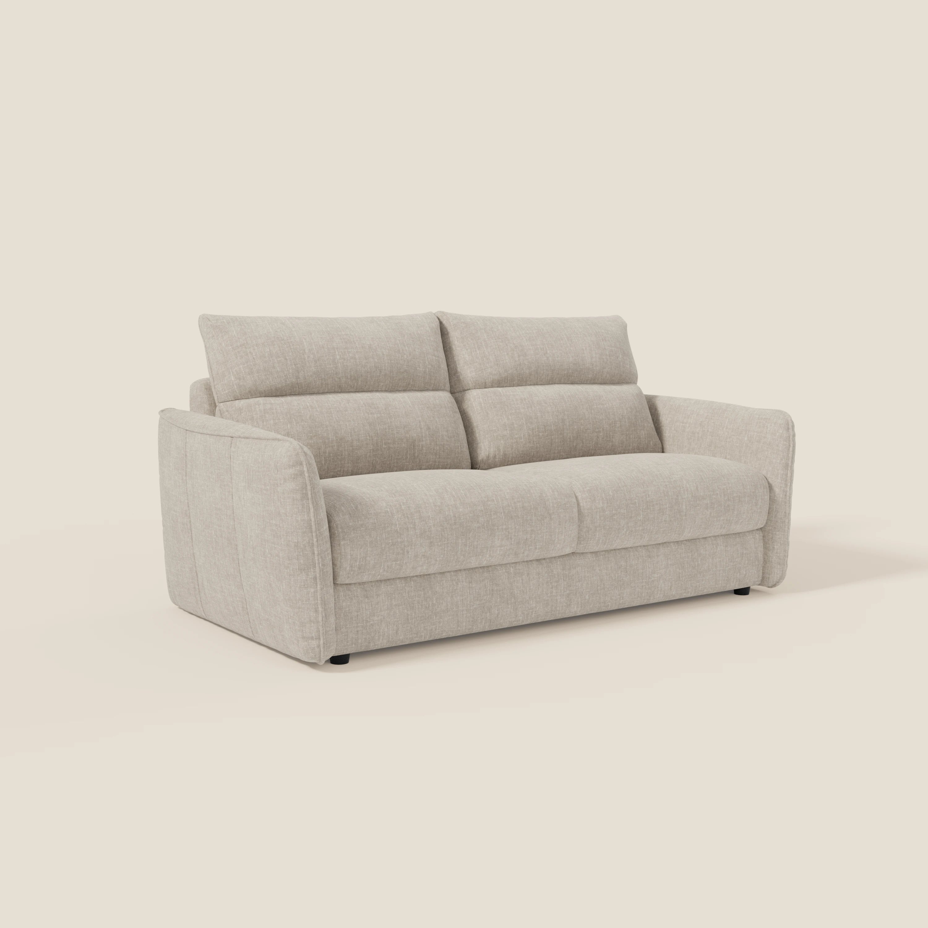 Elios ist das perfekte Schlafsofa für alle, die Komfort suchen, ohne Kompromisse beim Design einzugehen. Seine hohen Rückenlehnen mit beflockter Polsterung bieten eine weiche und entspannende Unterstützung, während die leicht ausgestellten Armlehnen dem Sofa einen modernen und eleganten Look verleihen. Maßgeschneiderte Details wie die Zwickelnaht an der Rückenlehne und der spezielle Welleneffekt an der Armlehne machen Elios zu einem echten Star im Wohnbereich.