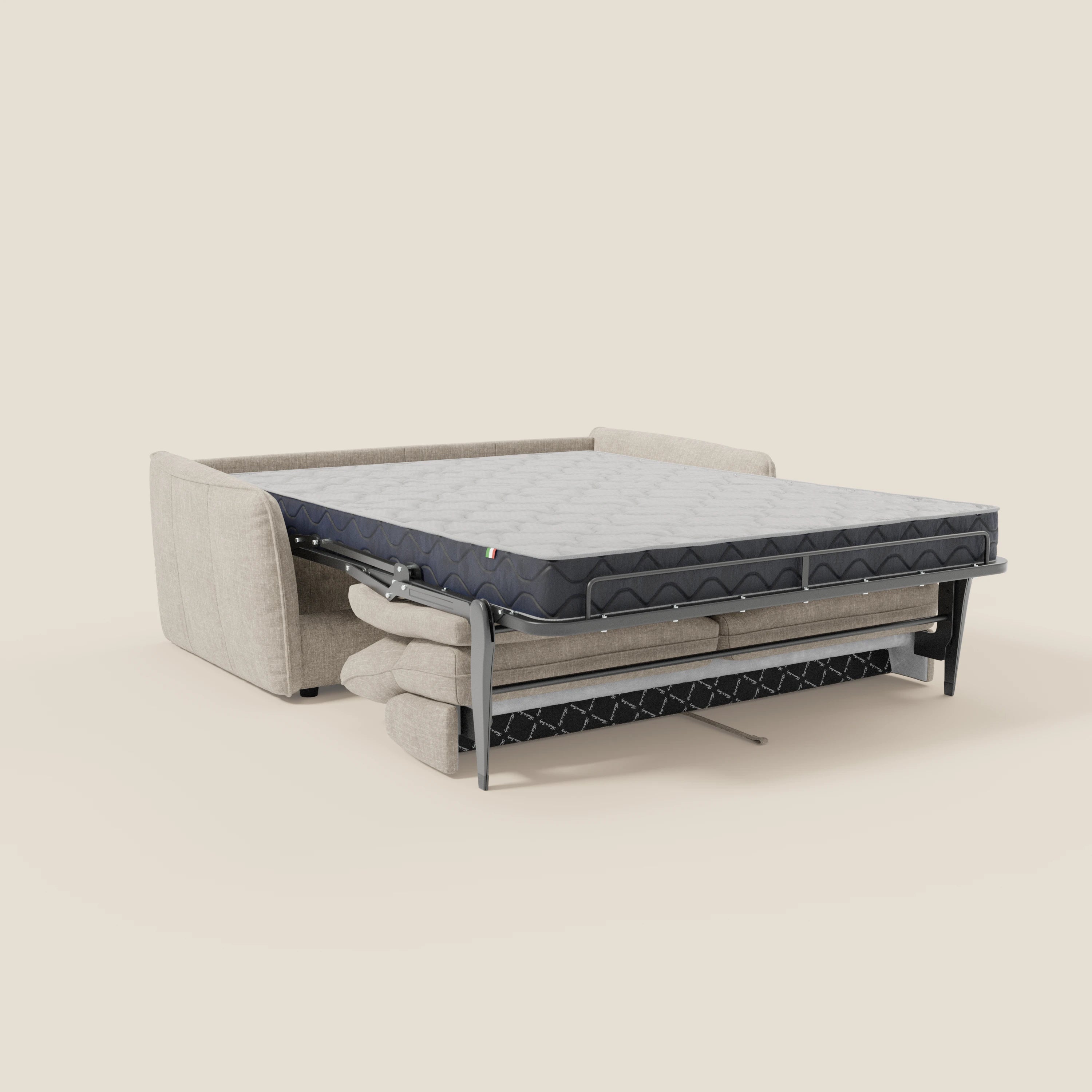 ELEKTROGESCHWEIßTES Bettnetz (Standard): Unsere Schlafsofas sind mit einem innovativen Klappensystem ausgestattet, das mit einer einfachen Bewegung das Öffnen des Mechanismus ermöglicht, ohne dass die Sitz- und Rückenkissen entfernt werden müssen. Das Gestell besteht aus hochfestem Möbelrohr mit Epoxy-Lackierung, um zu verhindern, dass die Teile korrodieren oder durch aggressive Stoffe beschädigt werden. Außerdem bietet es aus ökologischer Sicht zahlreiche Vorteile, da keine Lösungsmittel verwendet werden. Der Mechanismus wird mit Bajonettverschlüssen geliefert, die die Montage und Demontage des Sofas (Armlehnen, Rückenlehne, Blende) erleichtern und das Problem der Handhabung beim Transport lösen.