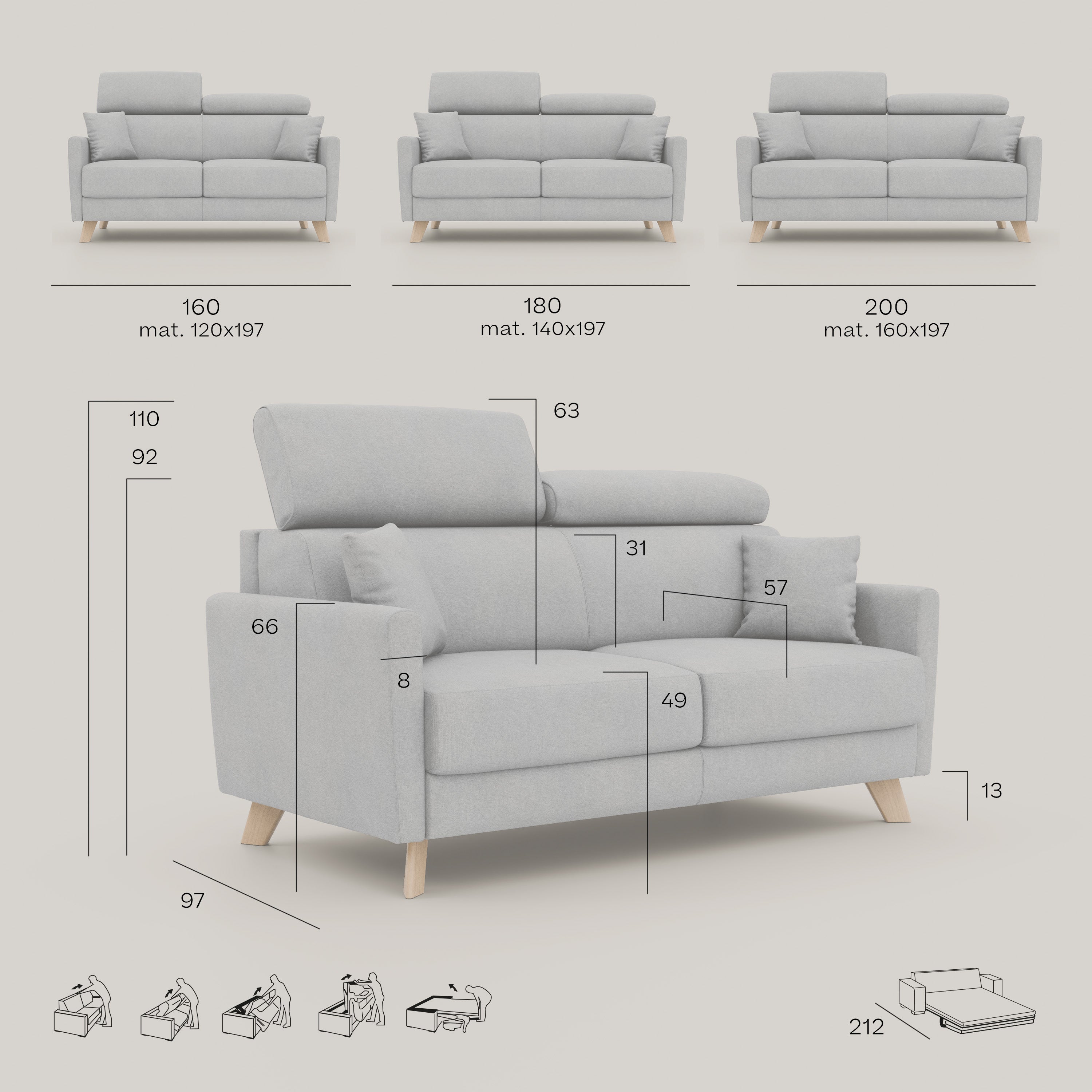 Mechanismus: Innovatives Klappensystem, das mit einer einfachen Bewegung das Öffnen des Mechanismus ermöglicht, ohne die Kissen von Sitz und Rückenlehne zu entfernen. Das Gestell ist aus hochfestem Möbelrohr mit Epoxy-Lackierung gefertigt, um zu verhindern, dass Teile korrodieren oder durch aggressive Mittel beschädigt werden