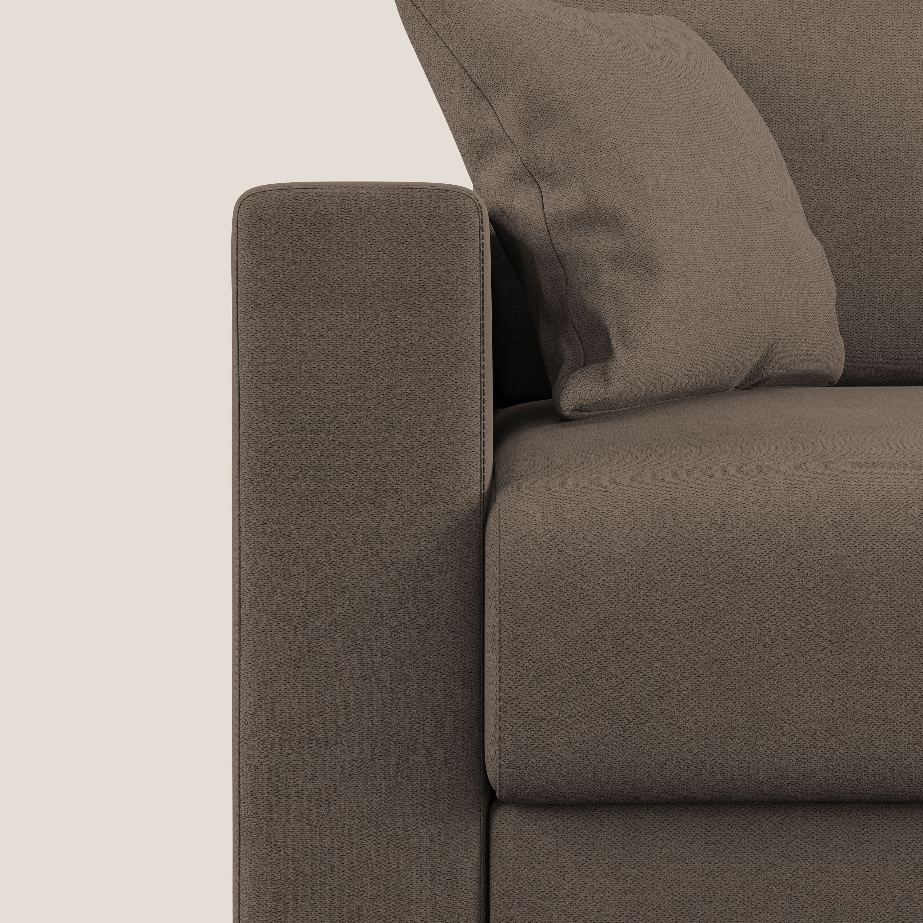 Mit seinen modernen Linien, die niemals zeitlos sind, ist er mit einem schmutzabweisenden, wasserfesten Bezug ausgestattet, der auch bei 30° gewaschen werden kann. Ausgestattet mit einem Kissenfach in der Rückenlehne und einem STAUFACH in der Halbinsel, bieten die 13 cm hohen Füße aus dunklem Wengeholz und die bequemen Armlehnen des Sofas eine Kombination aus Leichtigkeit und Eleganz. Ideal nicht nur für zeitgenössische und moderne Umgebungen, sondern auch für Wohnbereiche, die von einer natürlichen Inspiration oder von den Linien des modernsten und minimalistischen Designs bestimmt werden.