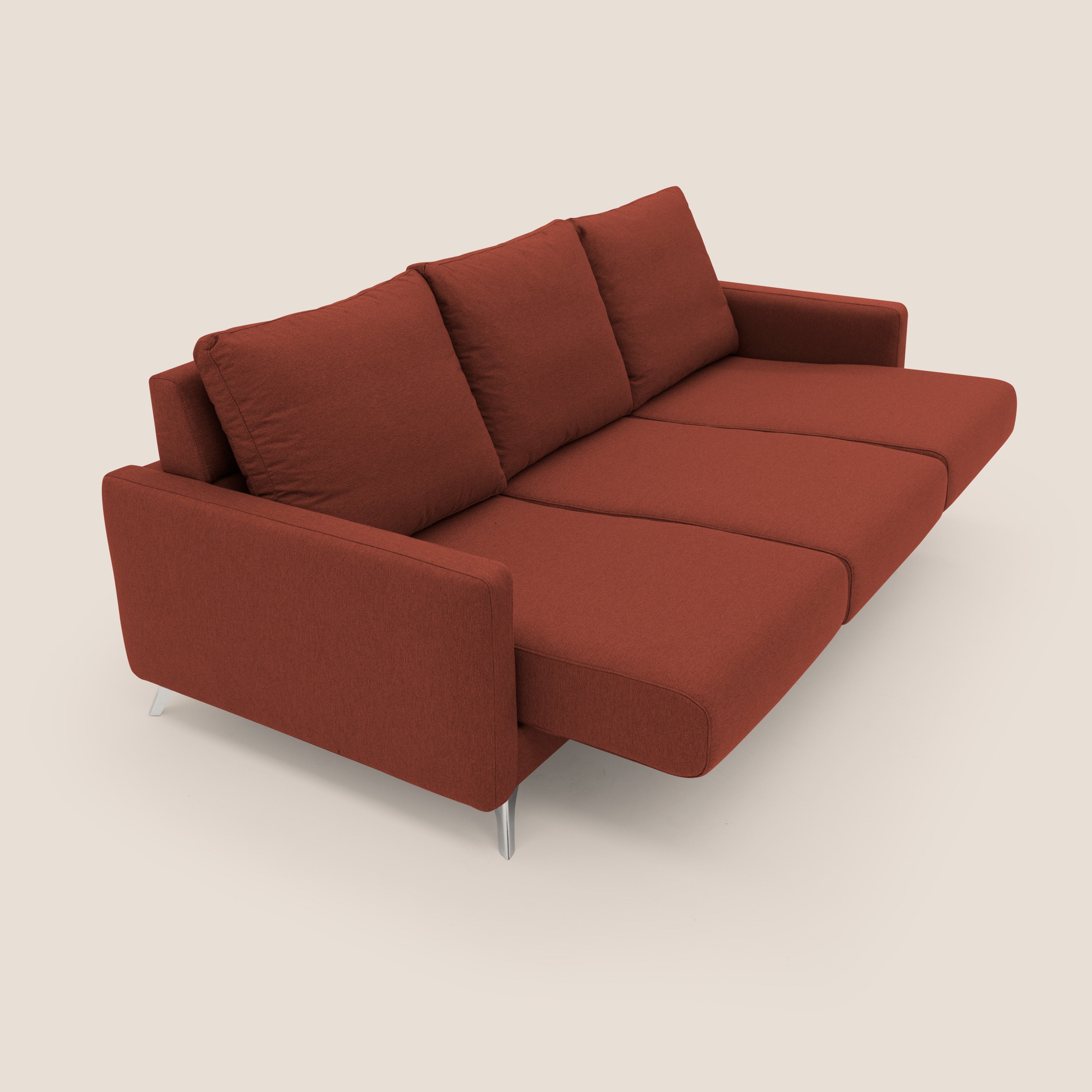 Die bequemen Sitze mit doppelter Dichte ergänzen das innovative Schiebesystem für die Sitze, das das Sofa praktisch macht und es an jede gewünschte Tiefe anpassen kann. Sie erhalten ein Sofa mit größerer Tiefe, das sich perfekt für flache Räume oder für diejenigen eignet, die sich mit ausgestreckten Füßen entspannen möchten.