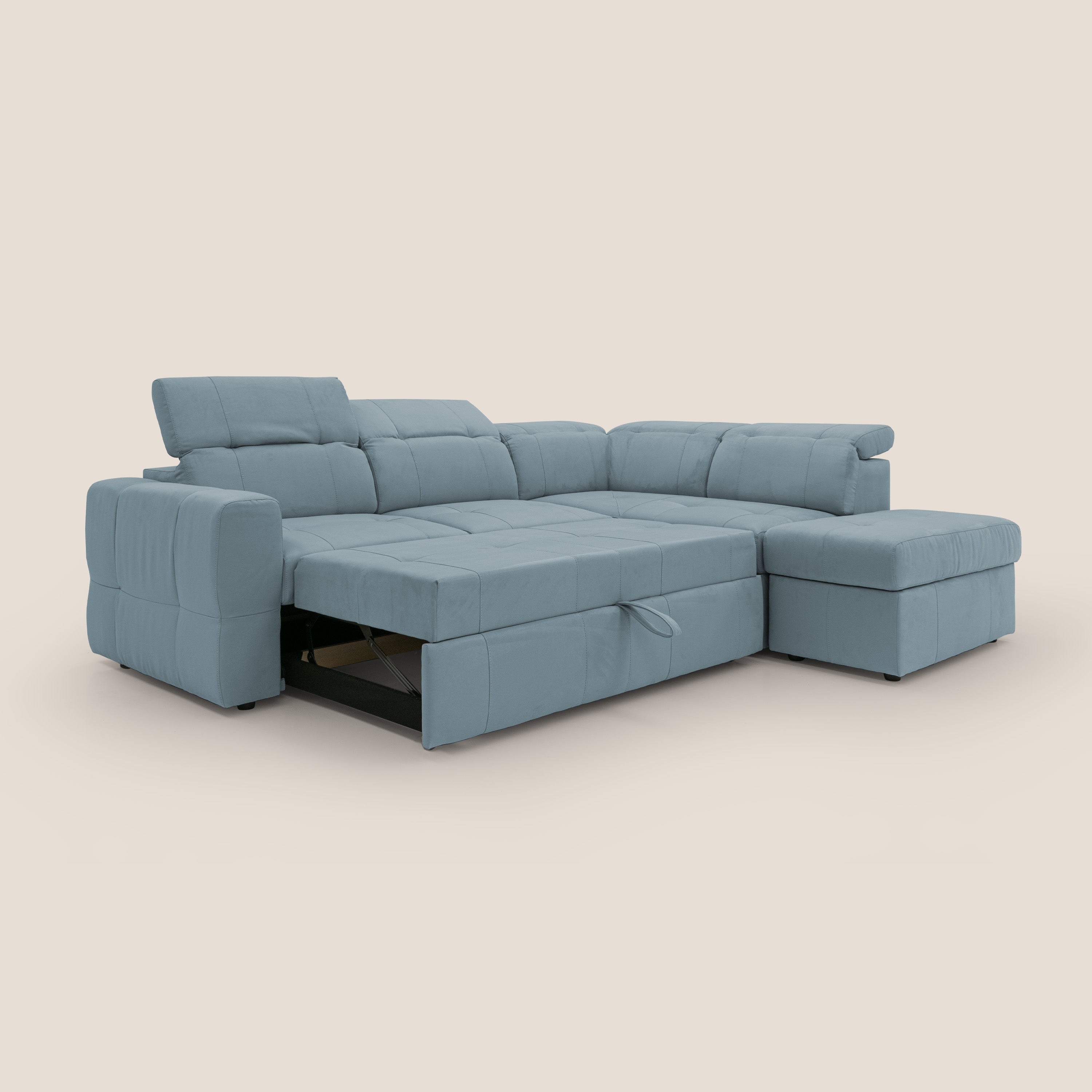 Entdecken Sie das Ecksofa Kronos, ein Meisterwerk an modernem Design und Funktionalität, das zu 100% in Italien handgefertigt wird. Dieses Sofa eignet sich perfekt für jede Art von Umgebung, dank der verstellbaren Kopfstützen, der ausziehbaren Ottomane, der Abschlussecke mit beweglichem Hocker mit Stauraum, um es je nach Verwendungszweck beliebig zu verschieben, und seiner handwerklichen Verarbeitung, die an das klassische Capitonné erinnert.