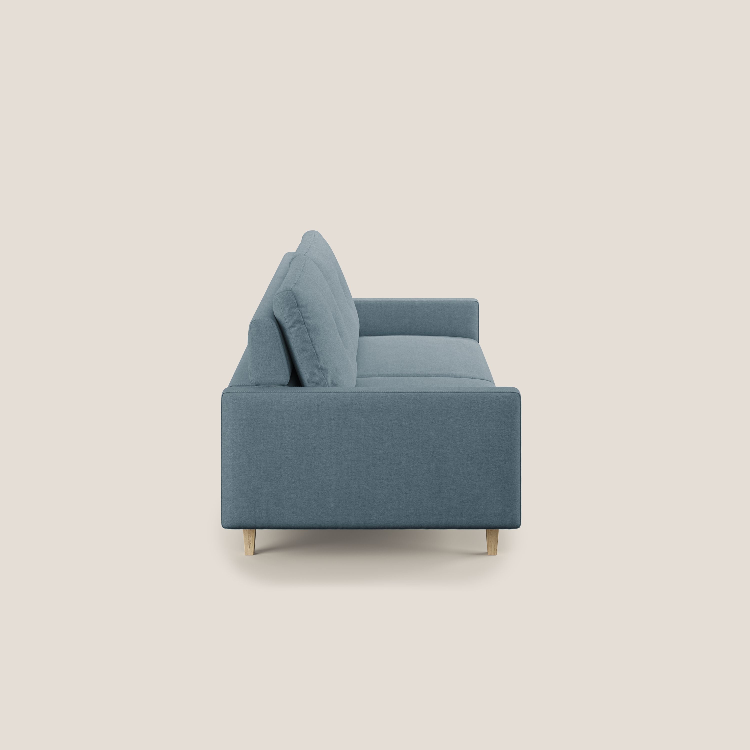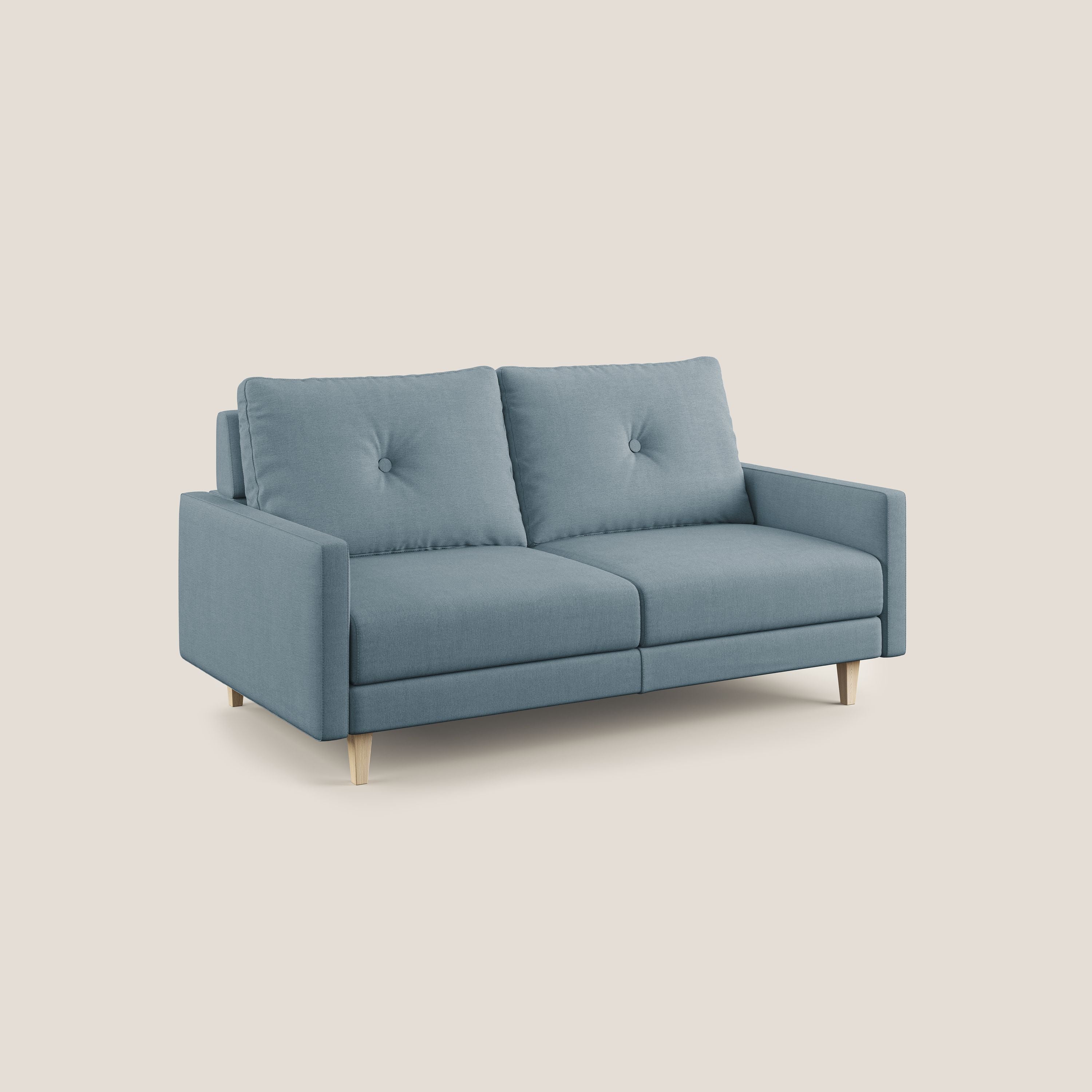 Modernes, schlankes und elegantes Sofa aus fleckenabweisendem und wasserfestem Stoff VOLLSTÄNDIG ABZIEHBAR, mit 15 cm hohen Füßen aus Naturholz und 2 verschiebbaren Sitzen, die je nach Bedarf beliebig verlängert werden können.