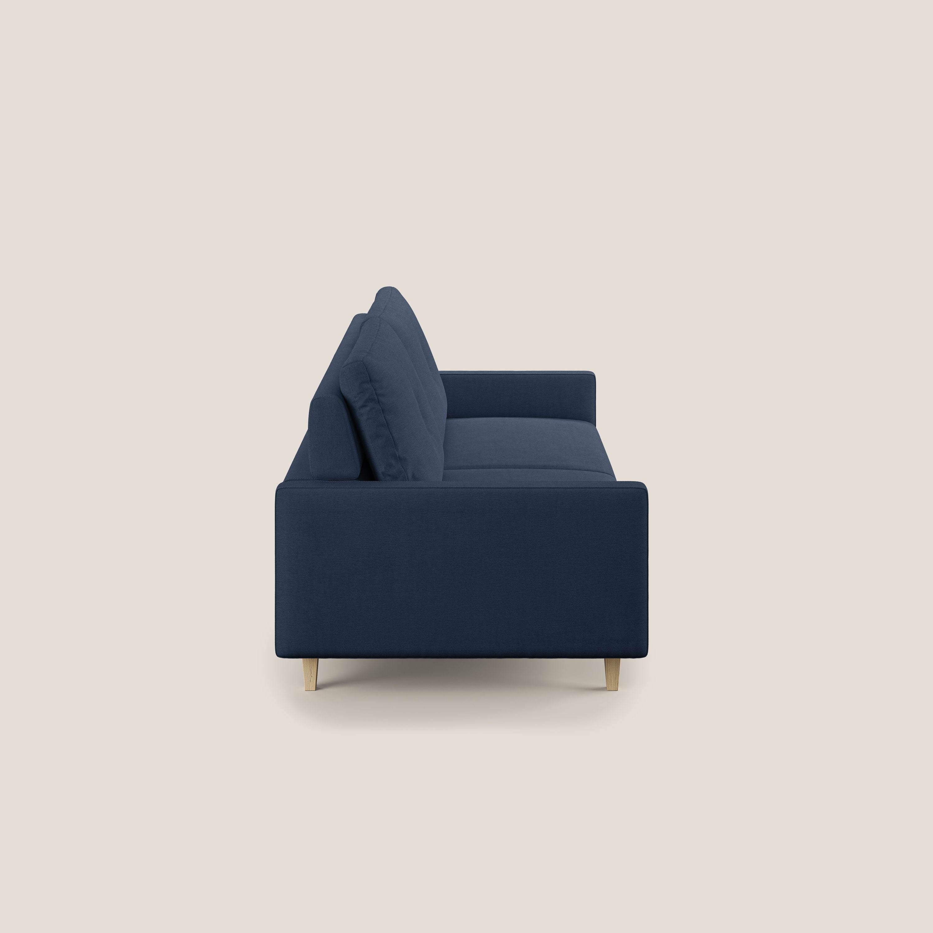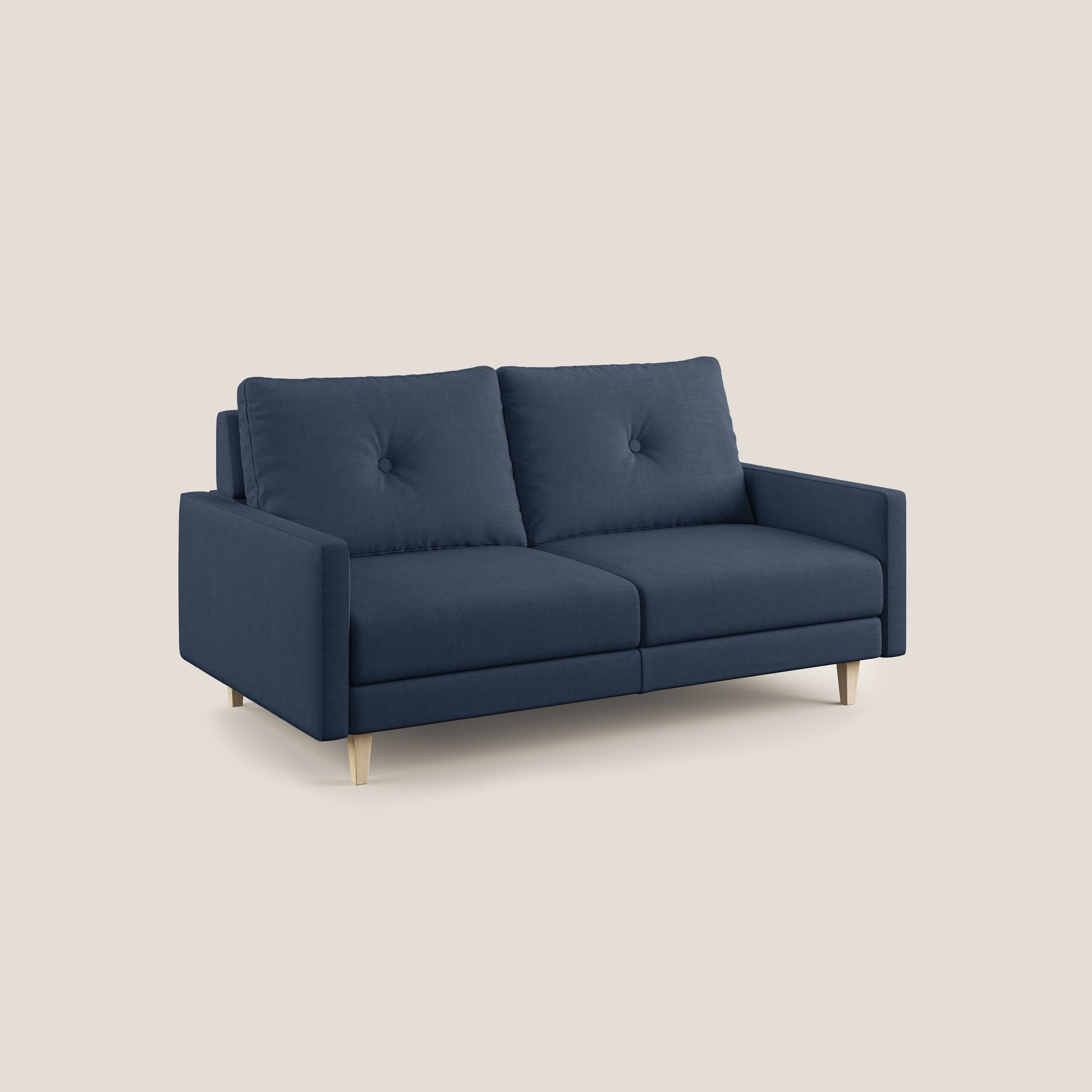 Modernes, schlankes und elegantes Sofa aus fleckenabweisendem und wasserfestem Stoff VOLLSTÄNDIG ABZIEHBAR, mit 15 cm hohen Füßen aus Naturholz und 2 verschiebbaren Sitzen, die je nach Bedarf beliebig verlängert werden können.