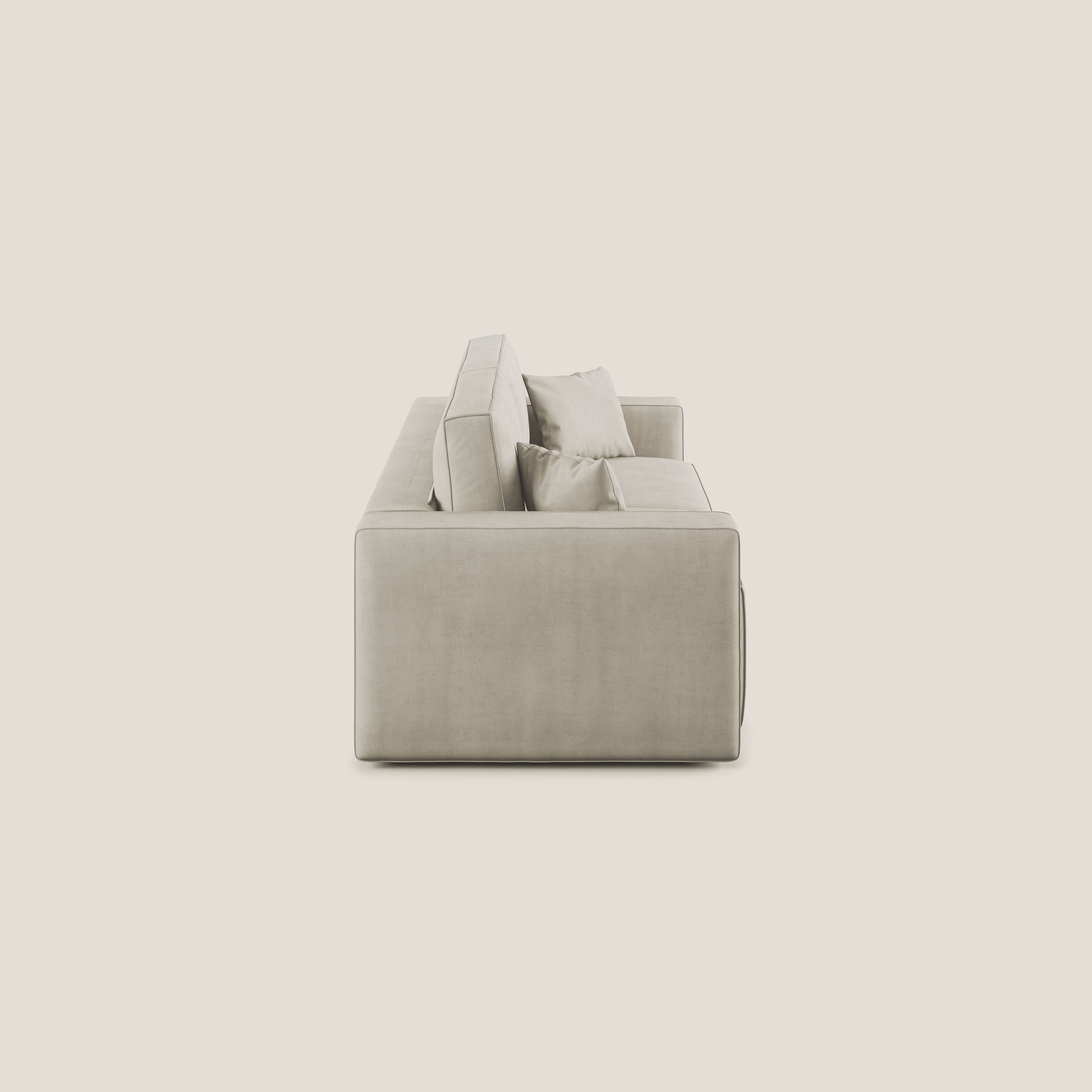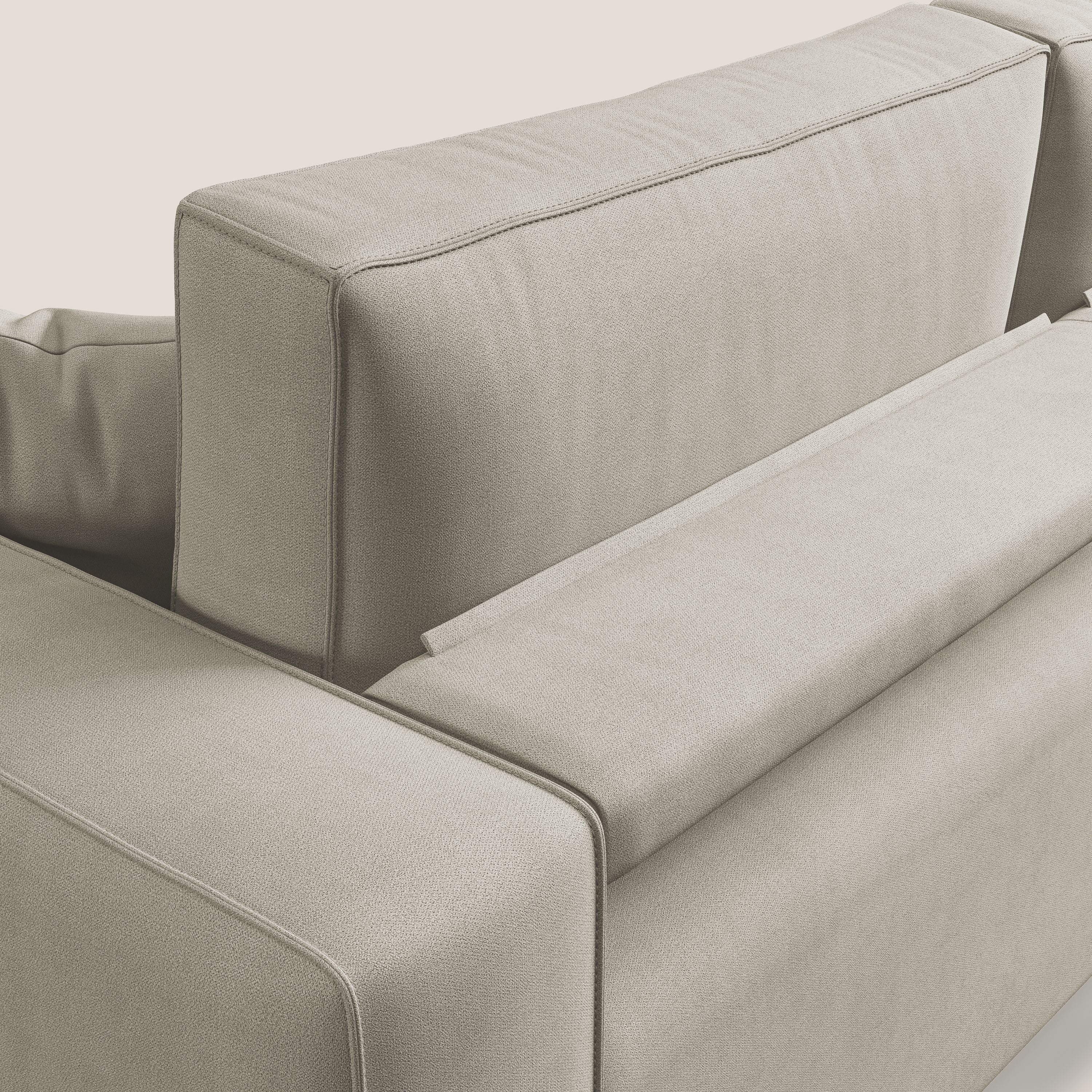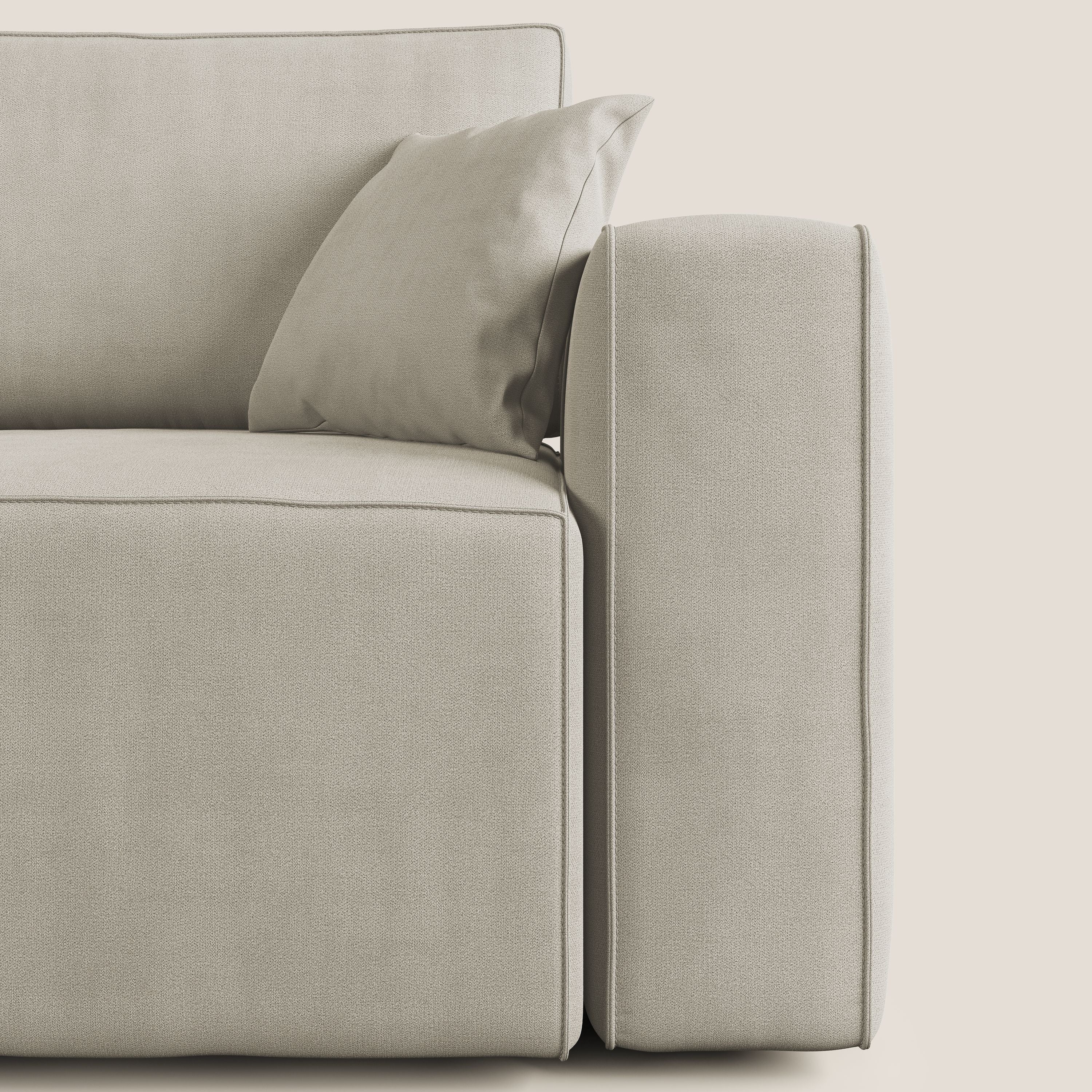 Vollständig abnehmbarer Bezug aus schmutzabweisendem Stoff mit wasserabweisender Behandlung. Die raffinierten Details in der Endverarbeitung verleihen dem Modell einen raffinierten Stil, der in seiner Art einzigartig ist, mit einer tadellosen Verarbeitung beim Nähen, bei der Auswahl der verwendeten Rohstoffe und in der Endphase der Polsterung jedes einzelnen Produkts.