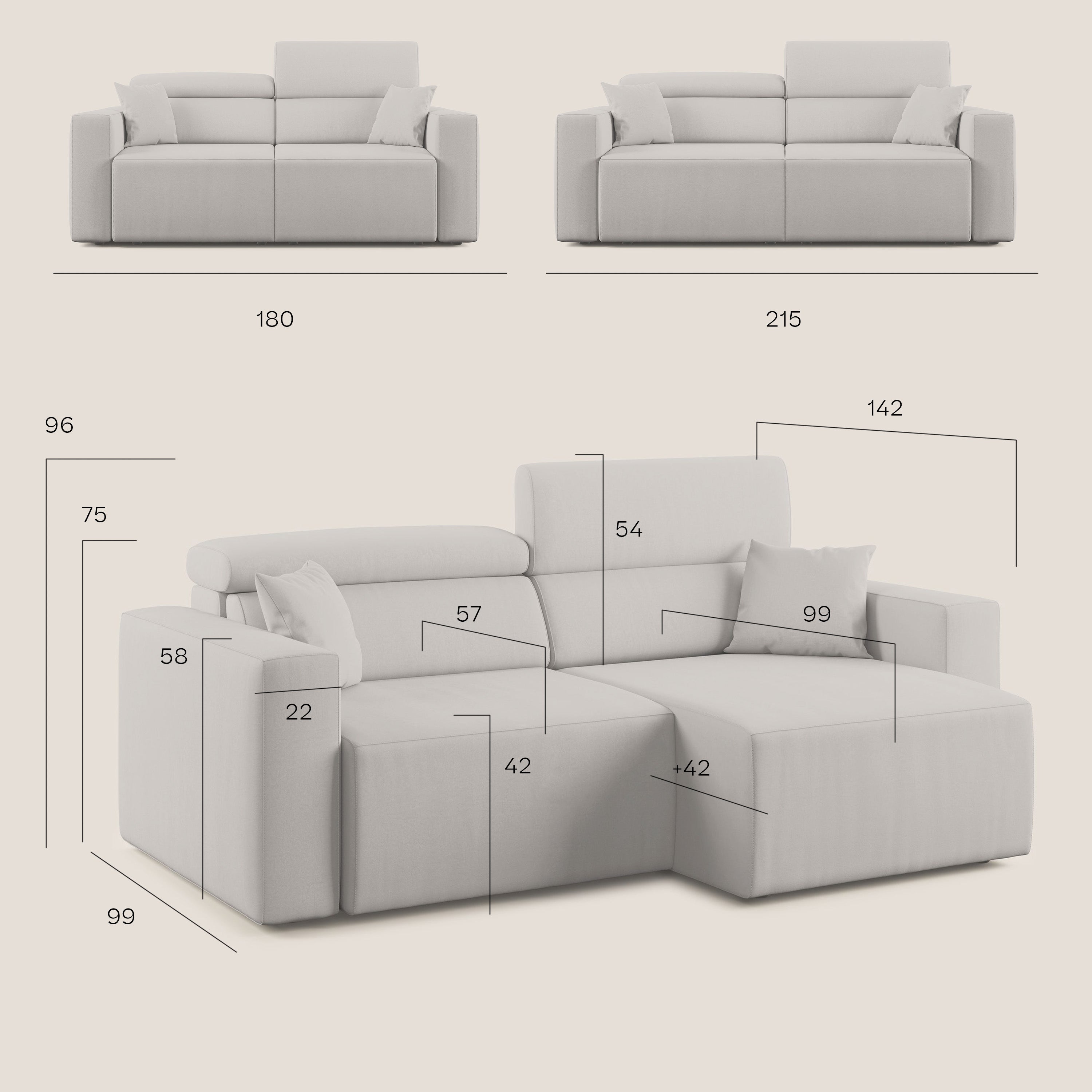 Sofahöhe: 75 cm / 96 cm mit offenen Kopfstützen