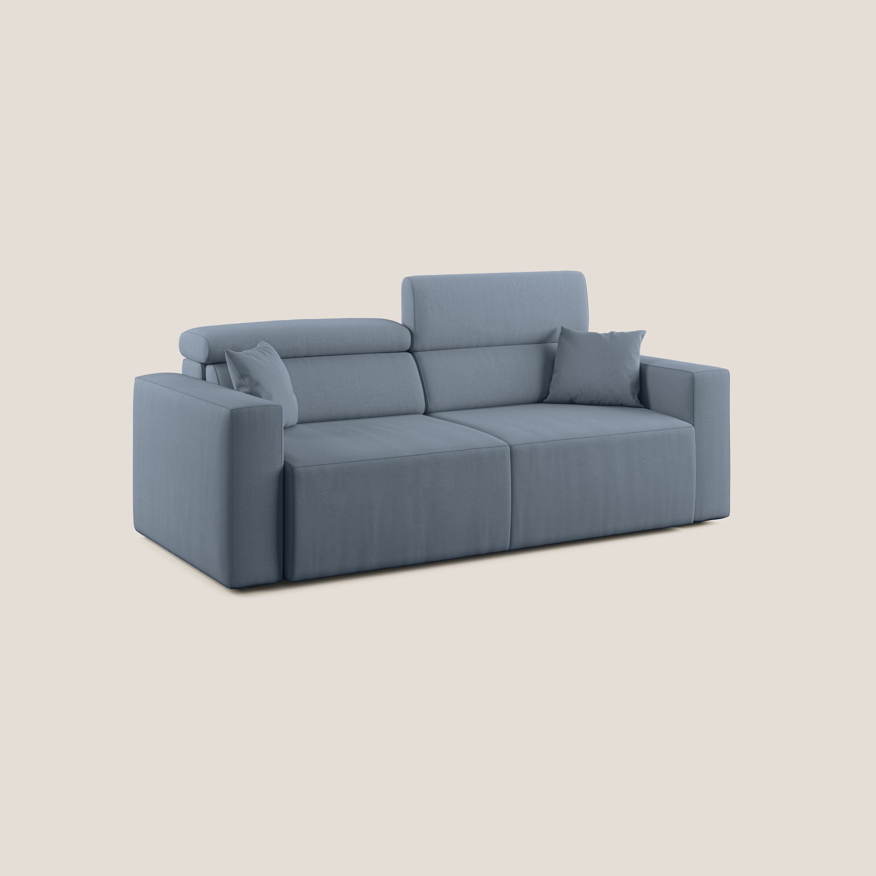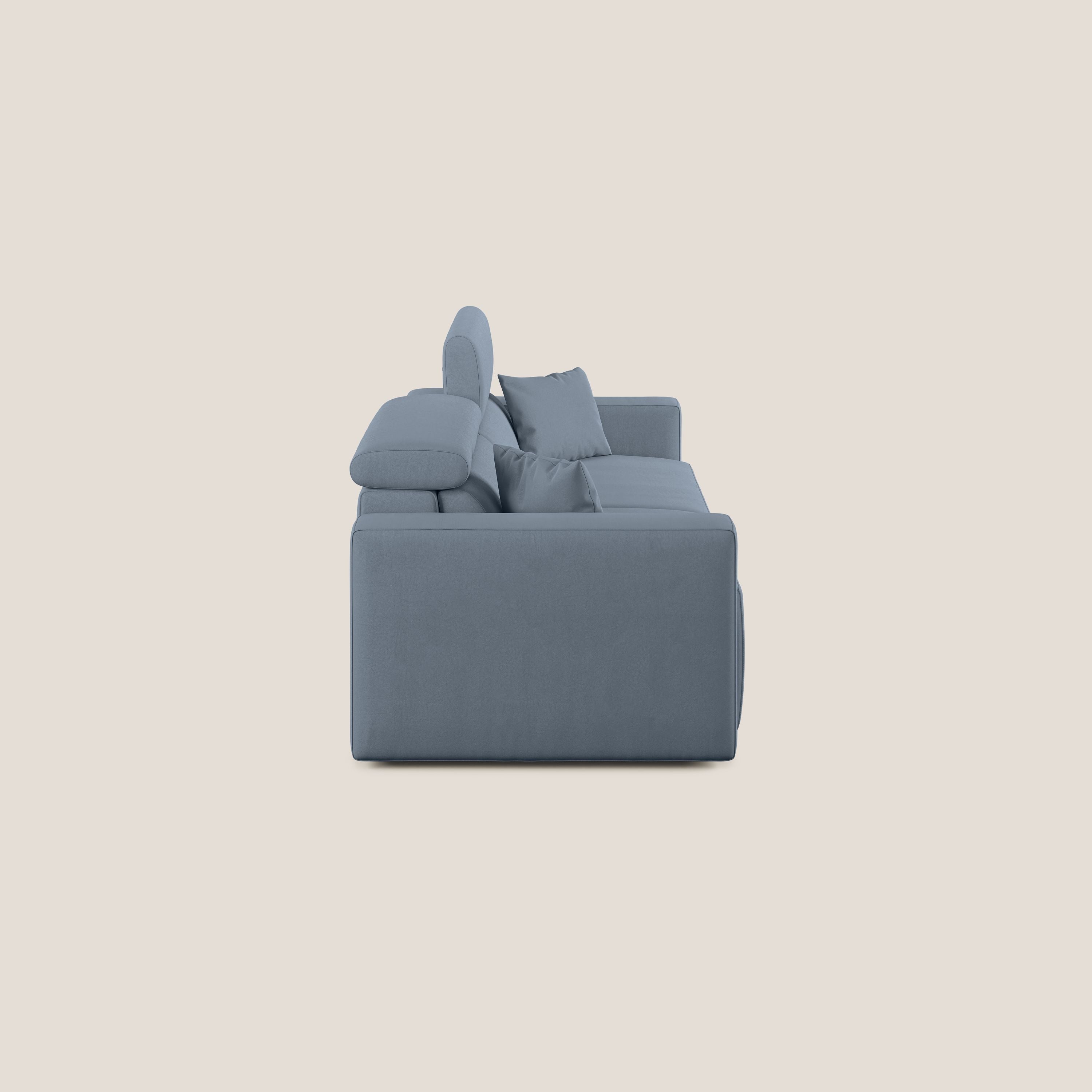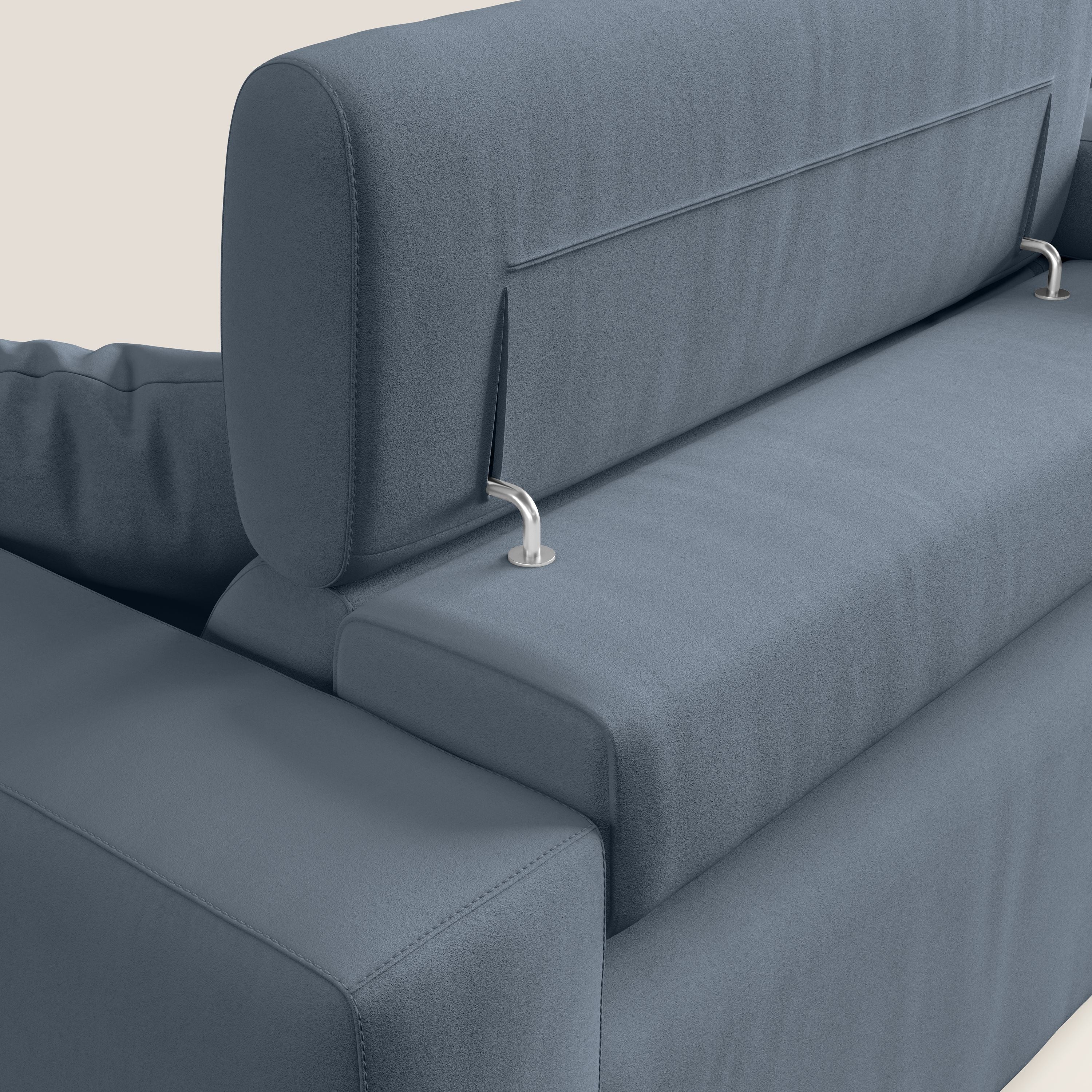 Vollständig abnehmbarer Bezug aus schmutzabweisender, wasserfester Mikrofaser mit wasserabweisender Behandlung, mit der sich Flecken einfach mit Wasser entfernen lassen. Dank des Schiebesystems kann jeder Sitz in eine bequeme Chaiselongue verwandelt werden, so dass jeder seine Beine auf dem Sofa ausruhen kann.