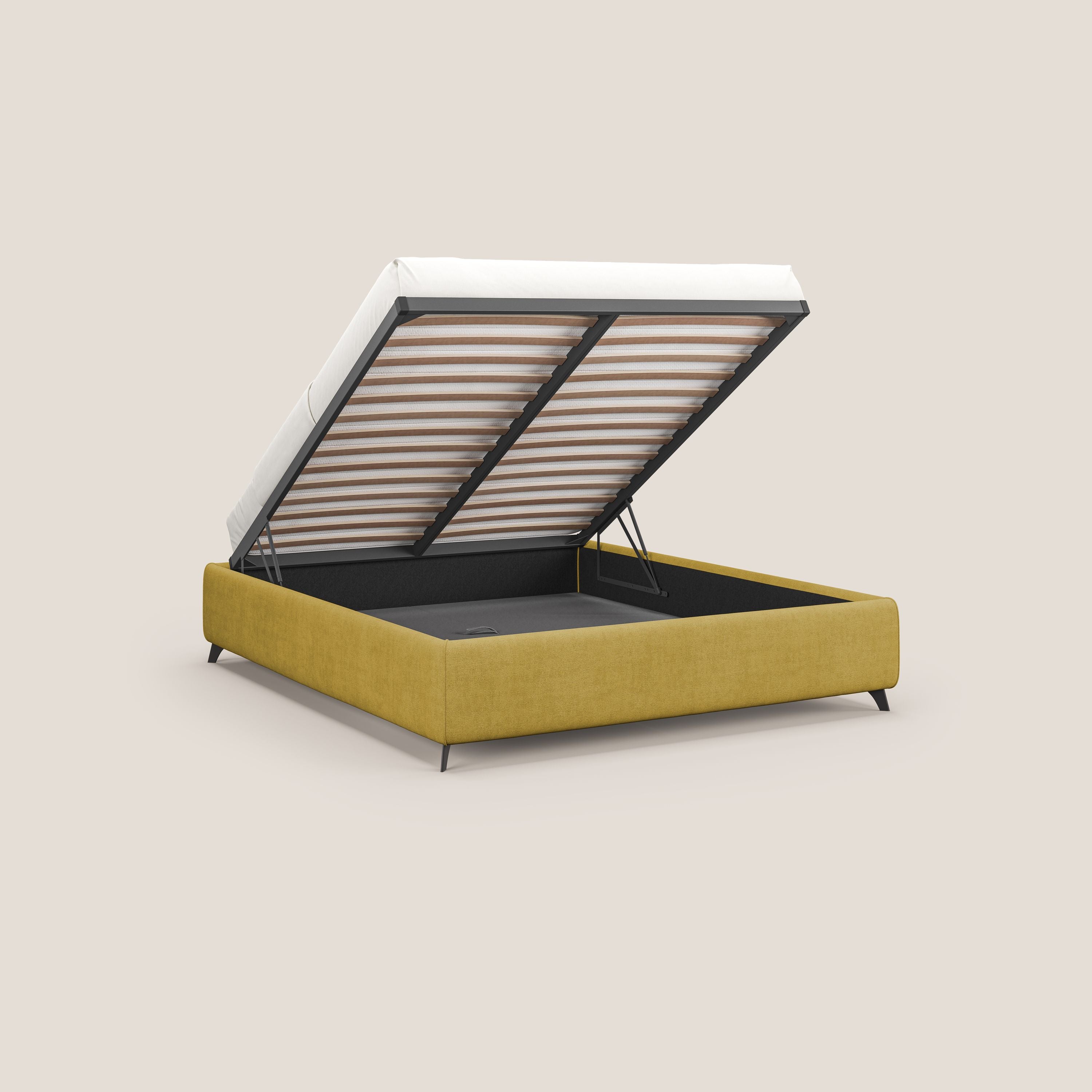 Versione contenitore : Apertura tramite relativi pistoni. Sottofondo rivestito in vellutino accoppiato removibile per la pulizia e sorretto da 3 robusti traversi che evitano il cedimento. In Dotazione un archetto in metallo cromato che sostiene il materasso sul lato testata quando si apre il contenitore.