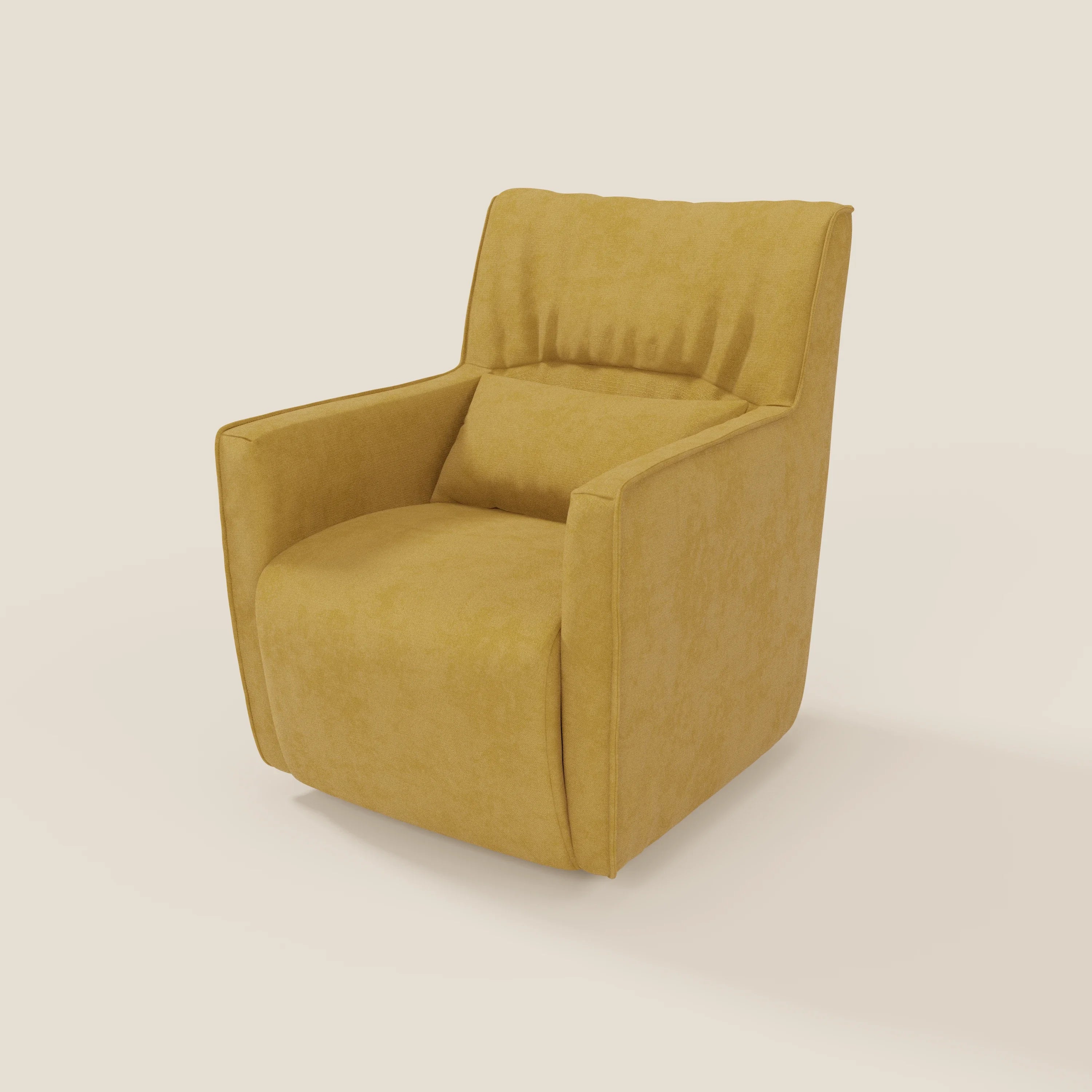 Tulla ist der Drehsessel, der kompakte Form und gemütlichen Komfort vereint. Sein modernes Profil, das durch die eleganten Nähte an der Rückenlehne und die Ziernähte an den Profilen aufgewertet wird, unterstreicht die weichen, klar definierten Linien und macht ihn zu einem vielseitigen Möbelstück mit Charakter.