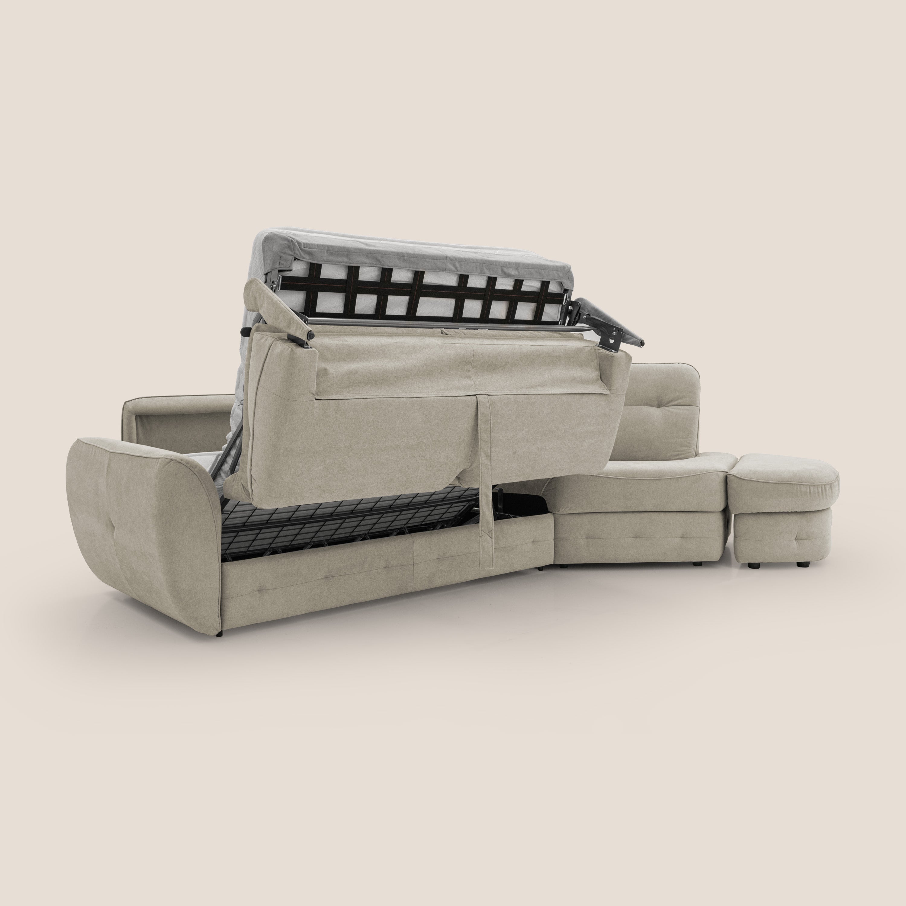 Mechanismus : Innovatives Klappensystem, das mit einer einfachen Bewegung das Öffnen des Mechanismus ermöglicht, ohne die Kissen von Sitz und Rückenlehne zu entfernen. Das Gestell ist aus hochfestem Möbelrohr mit Epoxy-Lackierung gefertigt, um zu verhindern, dass Teile korrodieren oder durch aggressive Mittel beschädigt werden