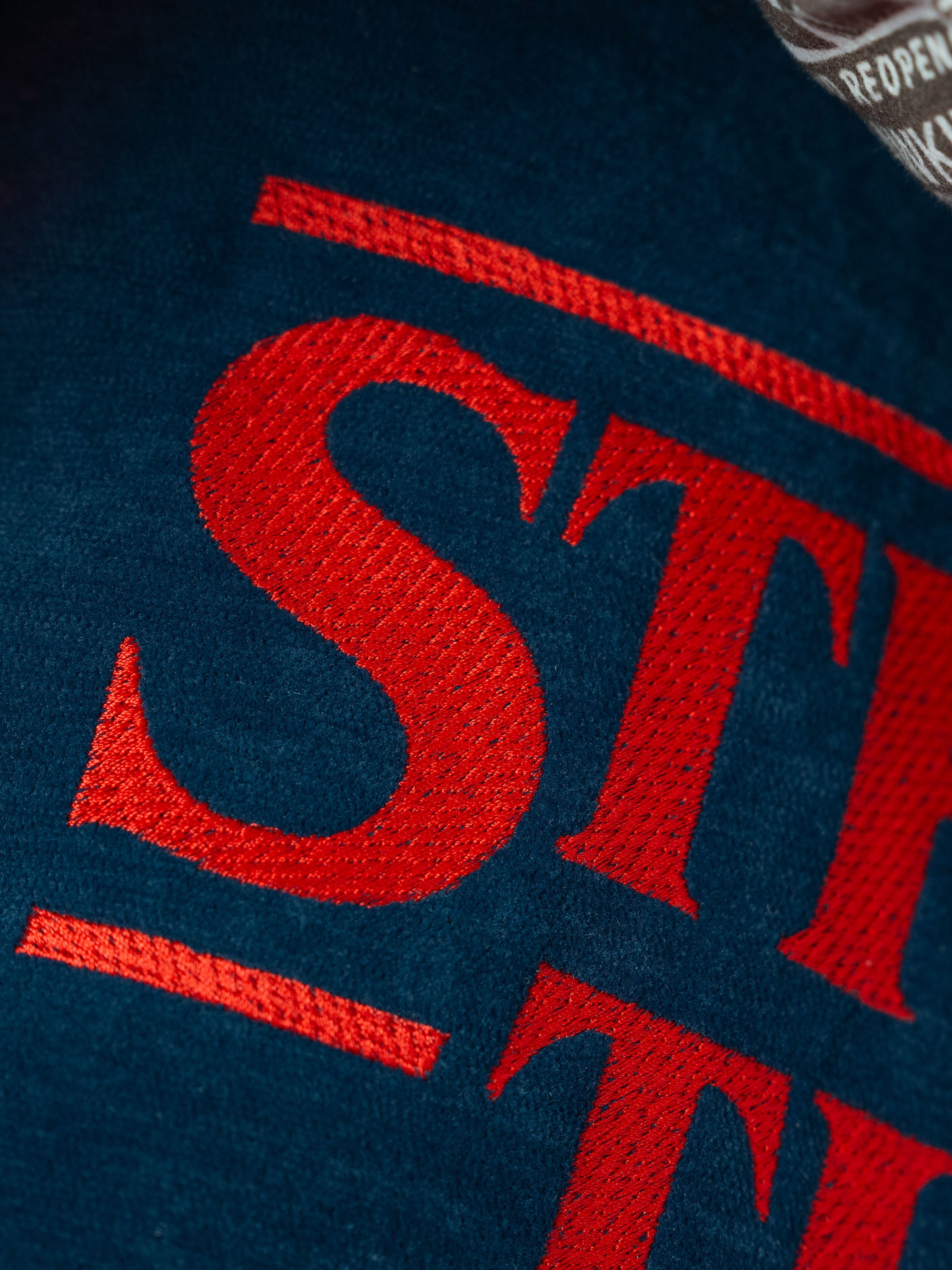 Il protagonista assoluto è il logo “Stranger Things” ricamato, realizzato con filati di alta qualità che donano profondità e definizione al lettering iconico della serie. Disponibile in tre varianti colore — rosso, blu e nero antracite — abbinate al ricamo in contrasto e alla cerniera di apertura coordinata alla tonalità del logo, per un dettaglio cromatico elegante e ricercato.