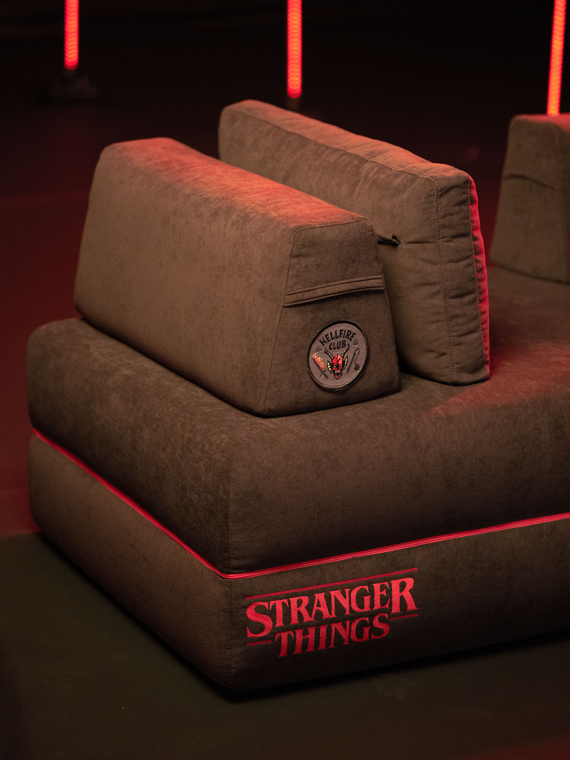 Il RIFT Stranger Things Edition si distingue per i dettagli ricercati e l’artigianalità Made in Italy. Il logo “Stranger Things” ricamato sul frontale, la patch Hellfire Club sul fianco dello schienale e la fodera interna trapuntata con stampa esclusiva ispirata alla cittadina di Hawkins rendono ogni pezzo un oggetto da collezione, pensato per chi ama arredare con personalità.