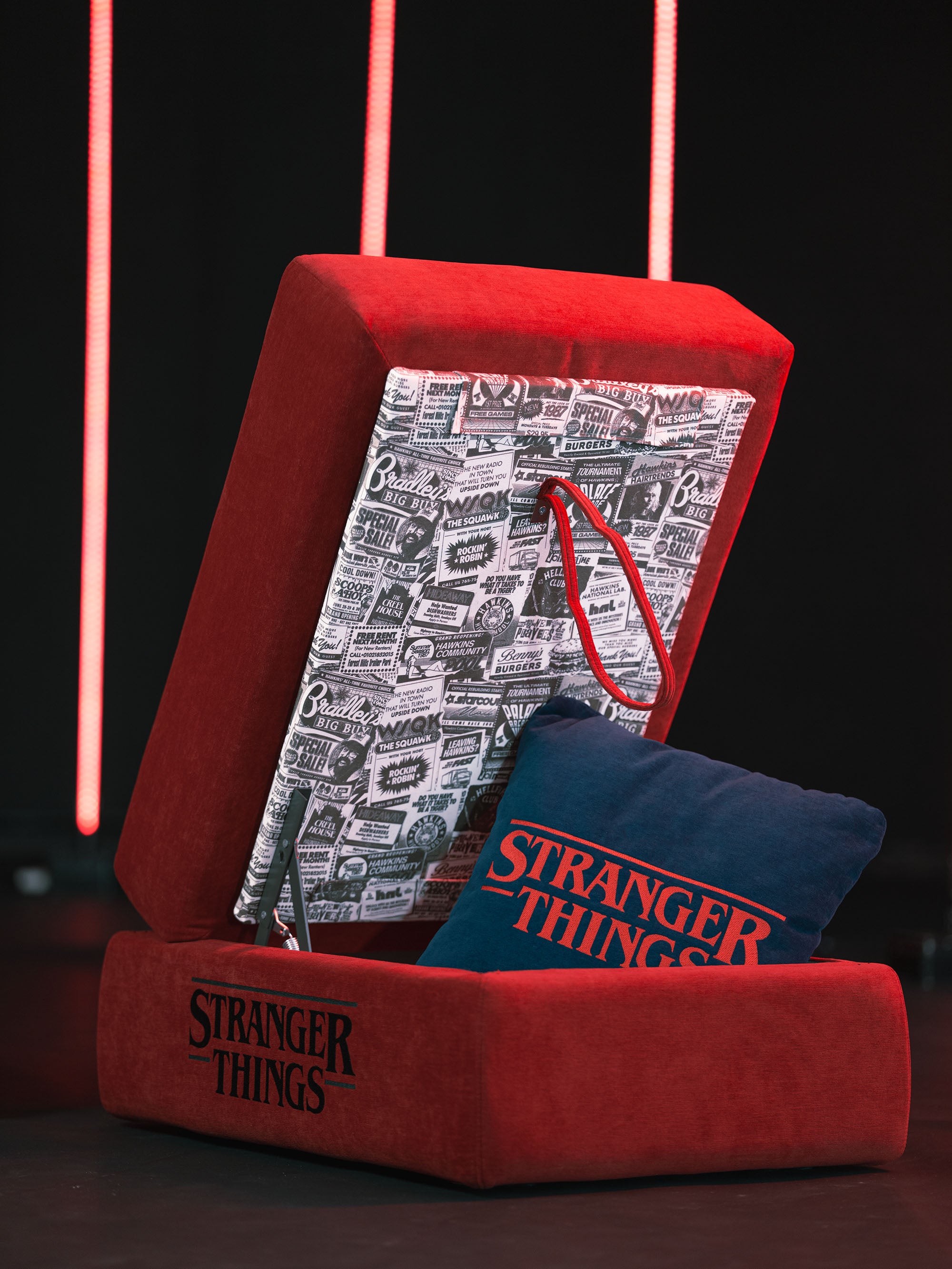 Sul fianco campeggia il logo “Stranger Things” ricamato, segno distintivo di questa edizione speciale, disponibile in tre colorazioni — rosso, blu e nero antracite — per adattarsi a ogni ambiente, dal living contemporaneo alla camera da letto. Ogni versione è completamente sfoderabile e realizzata con tessuti tecnici di alta qualità, morbidi al tatto, resistenti e facili da pulire.