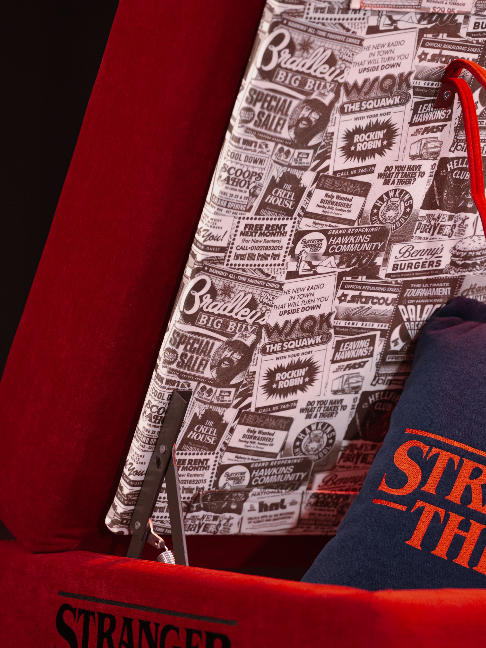 Il Pouf Sun misura 60x80 cm e si distingue per la sua anima duplice: esternamente un pouf elegante, pratico e versatile, perfetto come poggiapiedi, seduta o tavolino morbido; internamente un piccolo scrigno dedicato all’universo di Stranger things. Aprendolo tramite la maniglia in tessuto, rivela infatti una fodera interna stampata con le grafiche originali dell’Hawkins Post, il giornale immaginario della serie, in un mix di dettagli neri e bianchi che ne raccontano lo spirito cult.