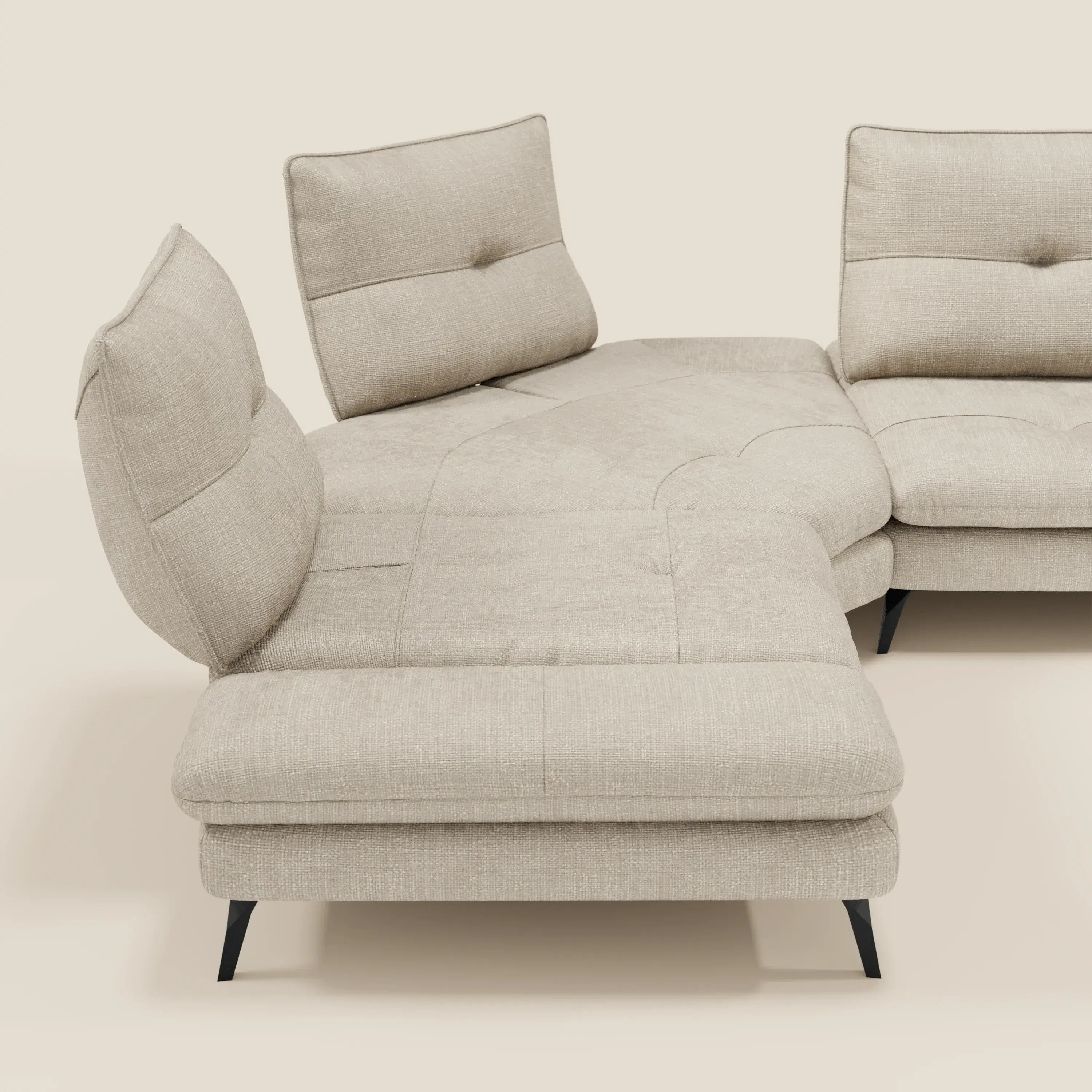 Divano Angolare - schienali traslanti e bracciolo regolabile in elegante tessuto impermeabile T06 panna