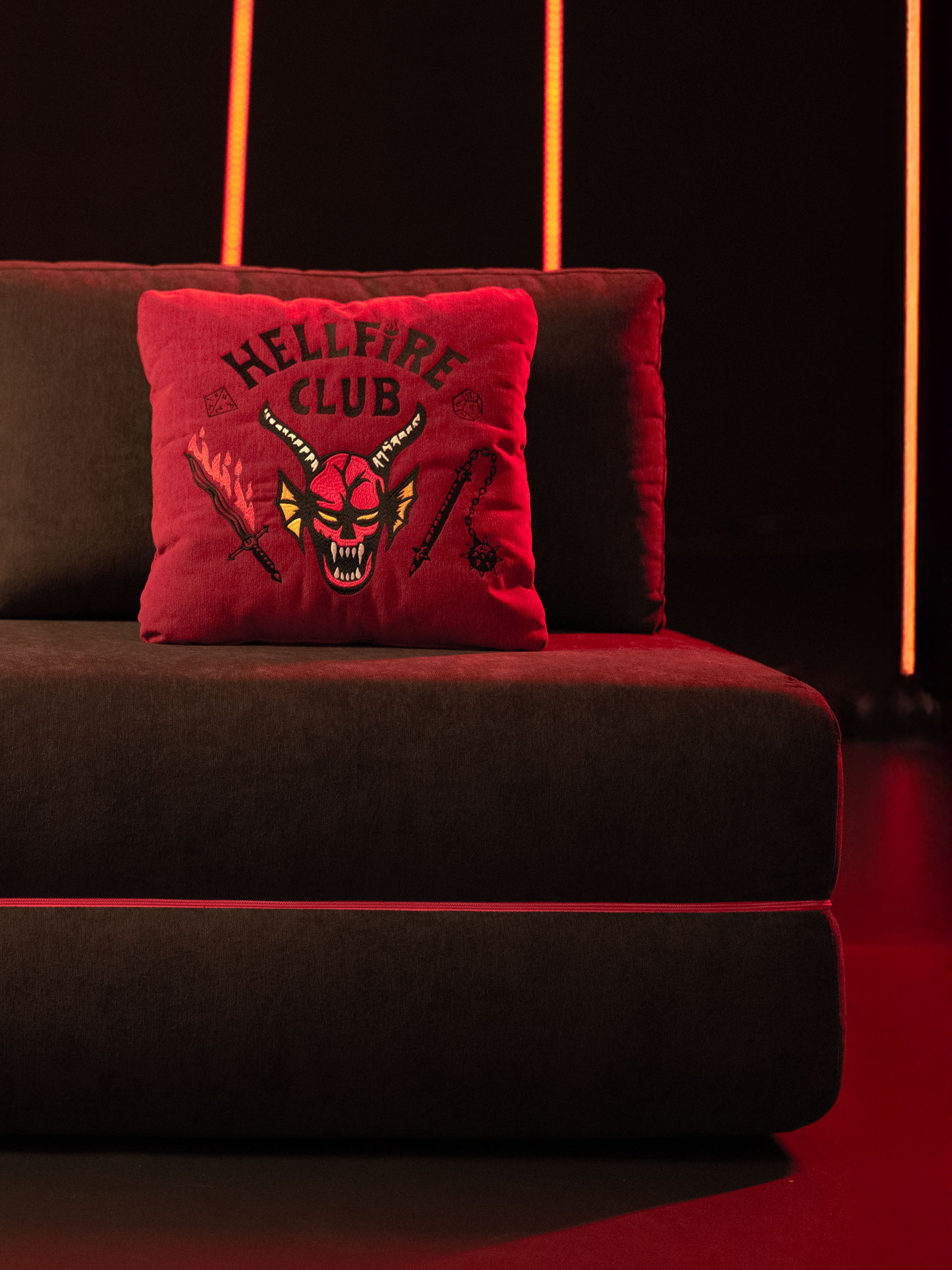 Logo “Stranger Things” ricamato sul frontale, patch Hellfire Club sul fianco e interno trapuntato con stampa esclusiva a tema Hawkins: ogni dettaglio racconta l’universo della serie Netflix e ne porta l’energia nel tuo spazio.