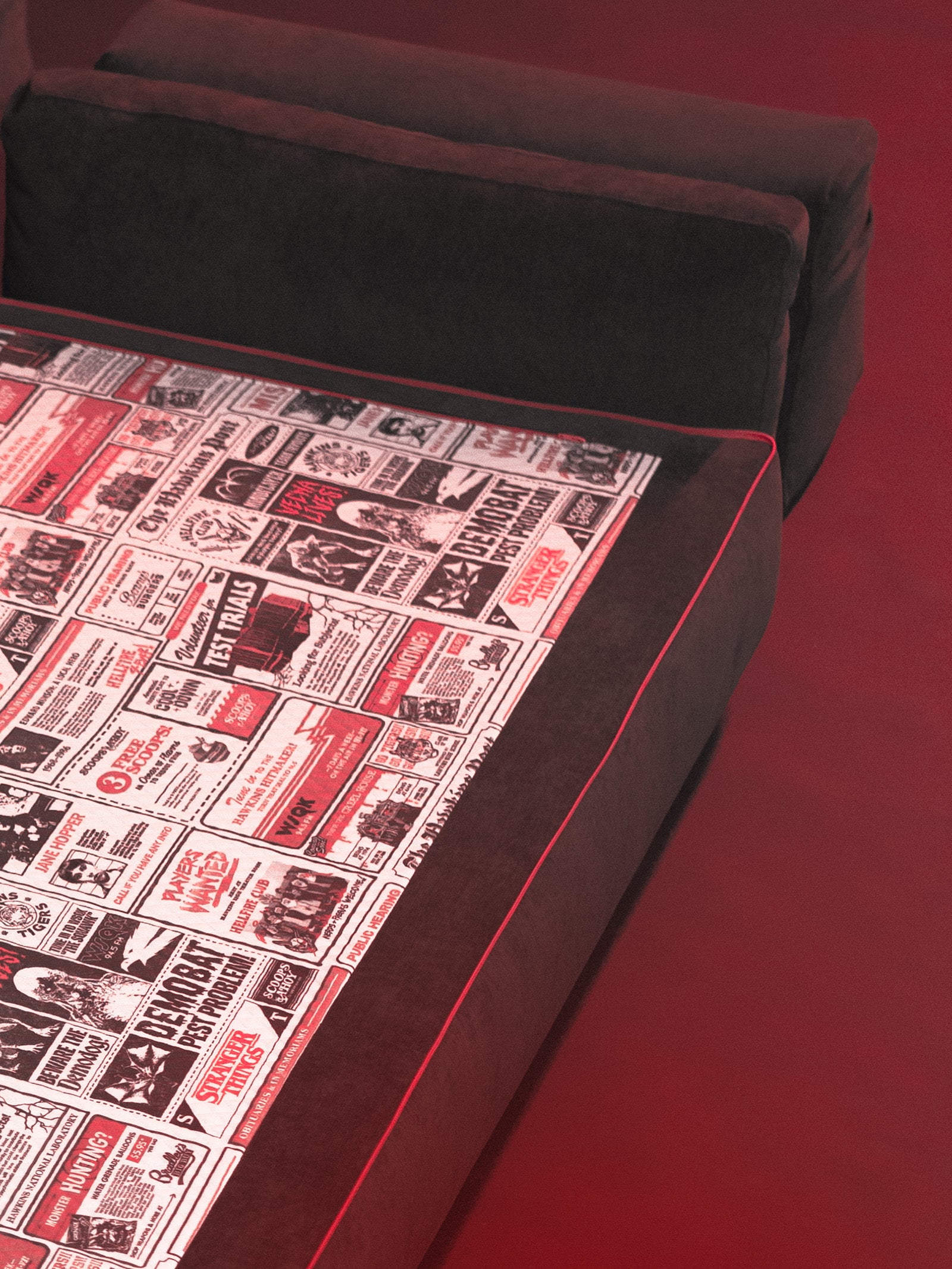 Come ogni pezzo della collezione Stranger Things Edition, anche la poltrona letto è curata nei minimi dettagli: il logo “Stranger Things” ricamato sul frontale, la patch Hellfire Club sul fianco e l’interno trapuntato con stampa a tema evocano le atmosfere della serie, rendendo ogni trasformazione un piccolo viaggio nel Sottosopra.