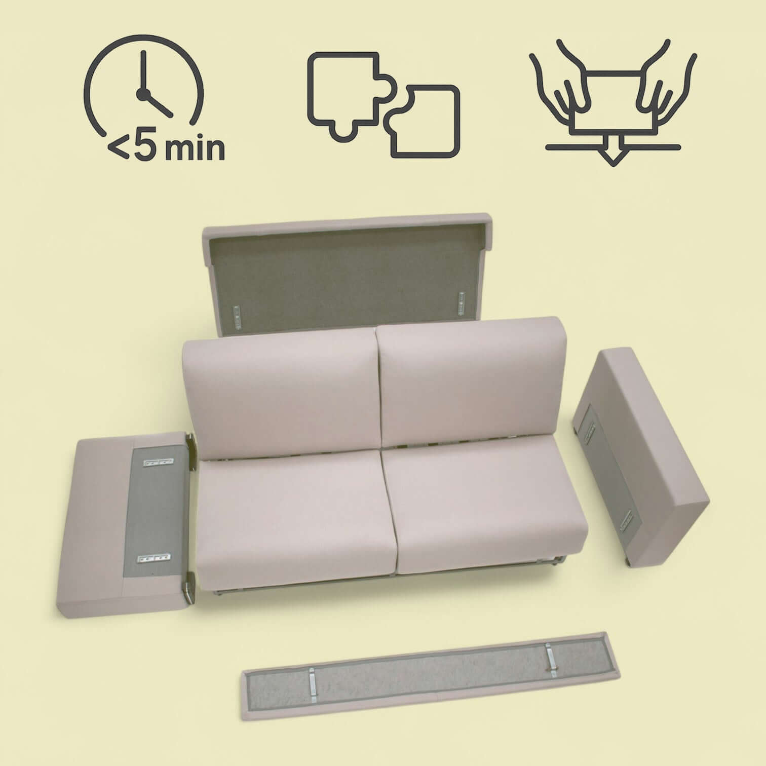 Montaggio veloce grazie ad un sistema di aggancio tramite baionette ottimo per trasporto e ingressi ridotti. Grazie ai braccioli sottili da 7 cm, Tommy offre una seduta profonda e spaziosa anche in ambienti ridotti. Il design compatto lo rende perfetto per ogni tipo di living.